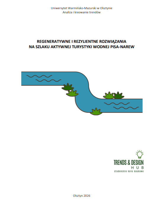 Raport przygotowany przez członków Studenckiego Koła Naukowego Trends&Design Hub, działającego przy kierunku Analiza i kreowanie trendów, we współpracy z Departamentem Turystyki i Sportu Urzędu Marszałkowskiego Województwa Warmińsko-Mazurskiego w Olsztynie. Celem raportu było rozwinięcie rezylientnego i regeneratywnego aspektu turystyki w związku z realizowanym projektem utworzenia szlaku aktywnej turystyki wodnej Pisa-Narew, który powstaje we współpracy samorządu Warmii i Mazur, Mazowsza oraz Podlasia.