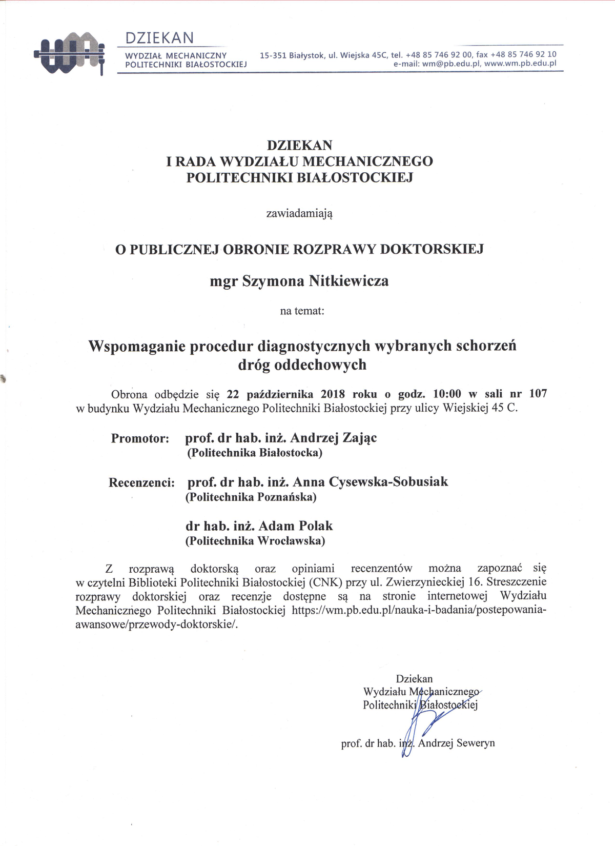 W dniu 22.10.2018 na Wydziale Mechanicznym Politechniki Białostockiej odbyła się obrona pracy doktorskiej mgr Szymona Nitkiewicza.