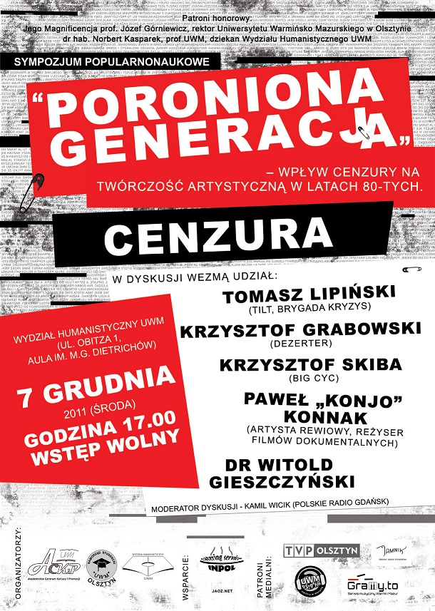 Tym razem porozmawiamy o wpływie cenzury na twórczość polskich artystów w latach 80-tych. Swoją obecność potwierdzili: Tomasz Lipiński (Tilt, Brygada Kryzys), Krzysztof Grabowski (Dezerter), Krzysztof Skiba (Big Cyc), Paweł "Konjo" Konnak i dr Witold Gieszczyński.