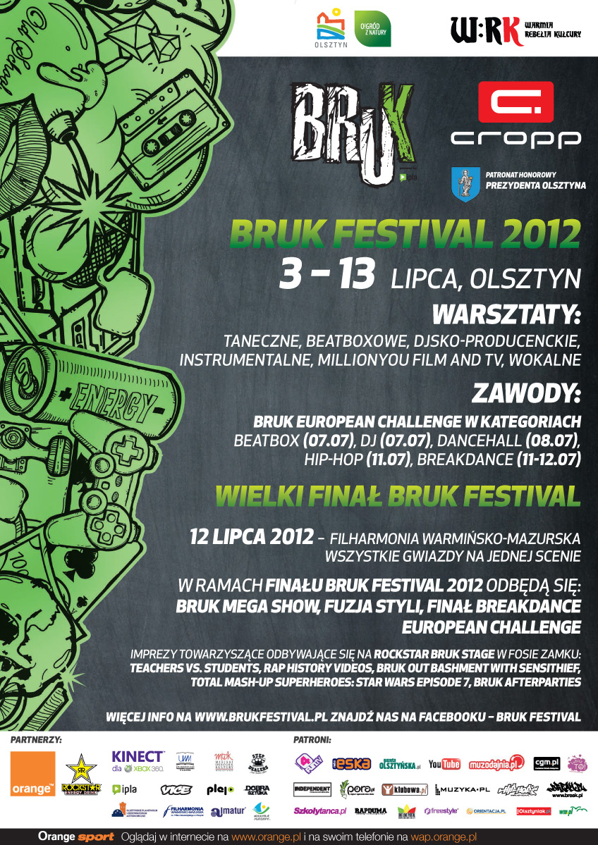 Bruk Festival we współpracy z Urzędem Miasta Olsztyna, Urzędem Marszałkowskim Województwa Warmińsko-Mazurskiego, Filharmonią Warmińsko Mazurską, Planetarium i Obserwatorium Astronomicznym, Uniwersytetem Warmińsko Mazurskim i Miejskim Ośrodkiem Kultury Olsztyn zapraszają na największe wydarzenie kulturalne tego roku - Bruk Festival 2012.