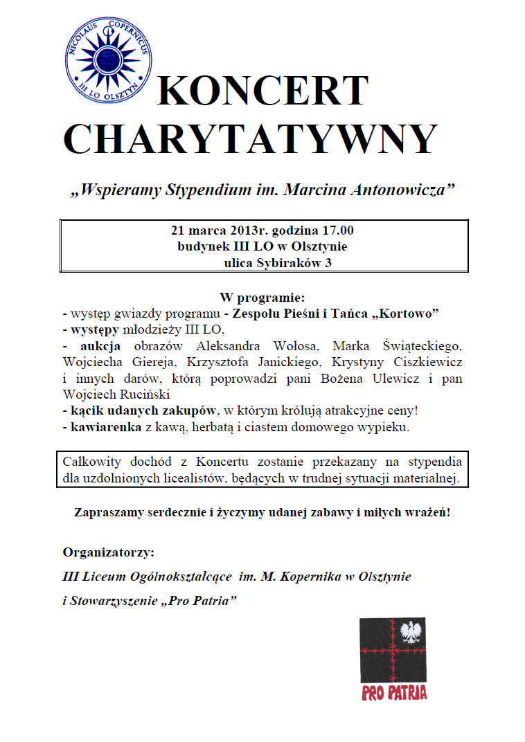 Grudzień III LO im. M. Kopernika w Olsztynie i Stowarzyszenie "Pro Patria" zapraszają na Koncert Charytatywny