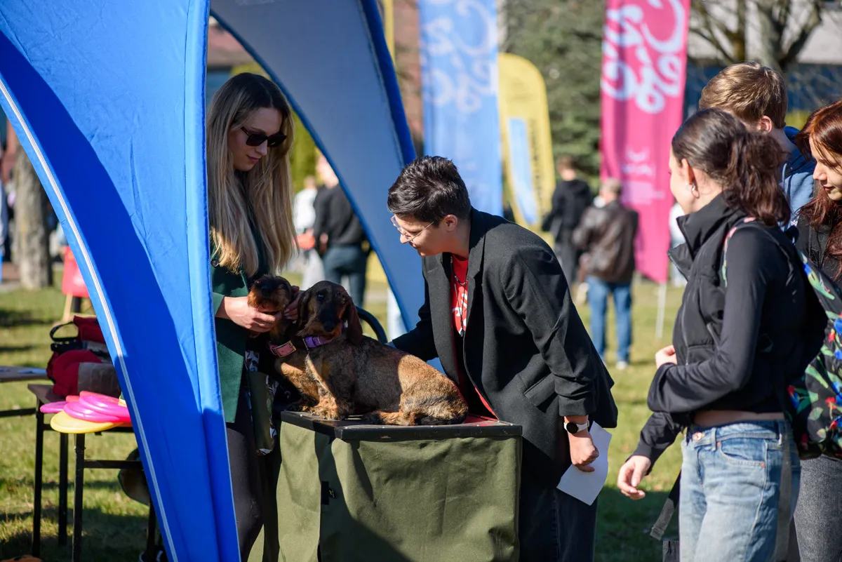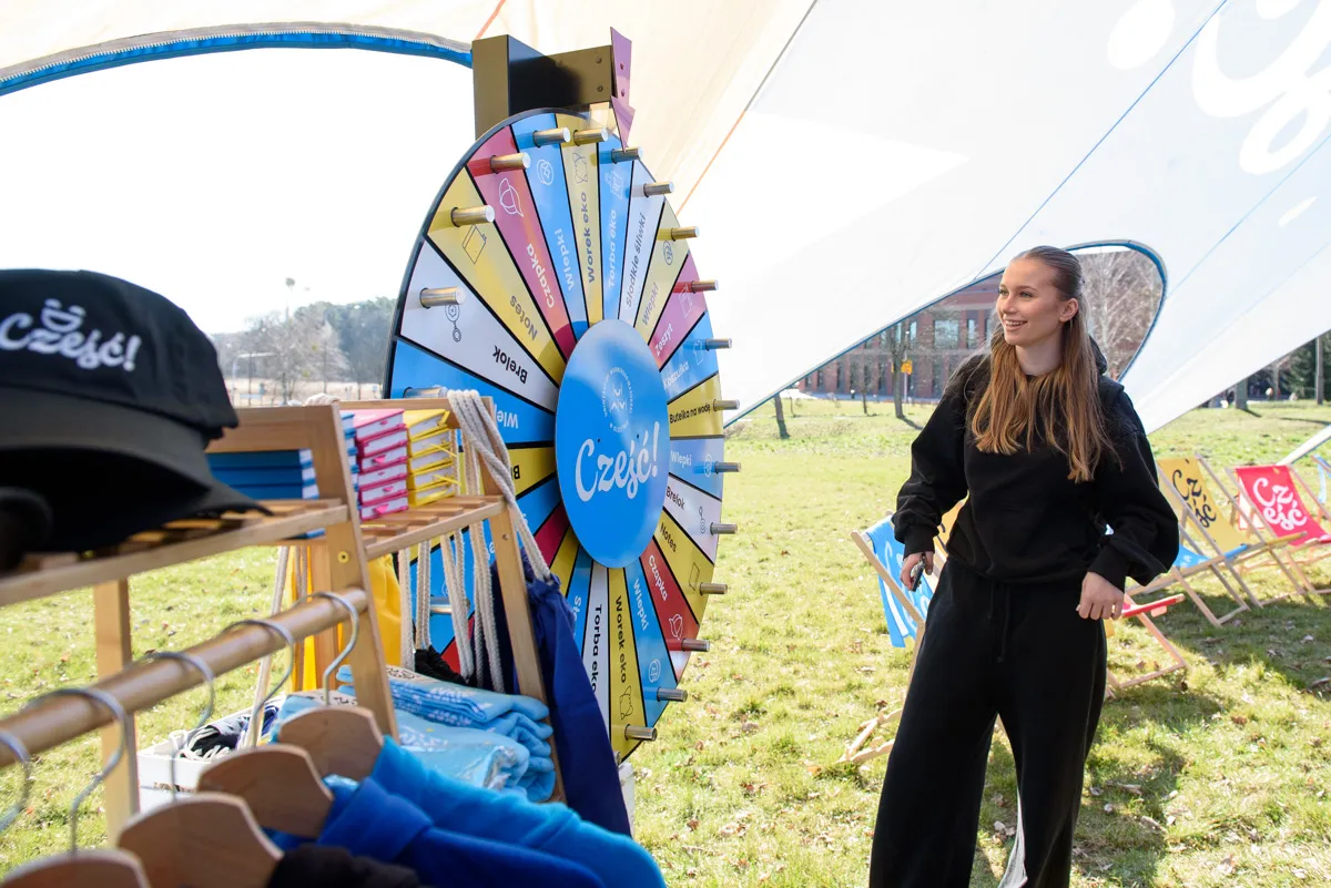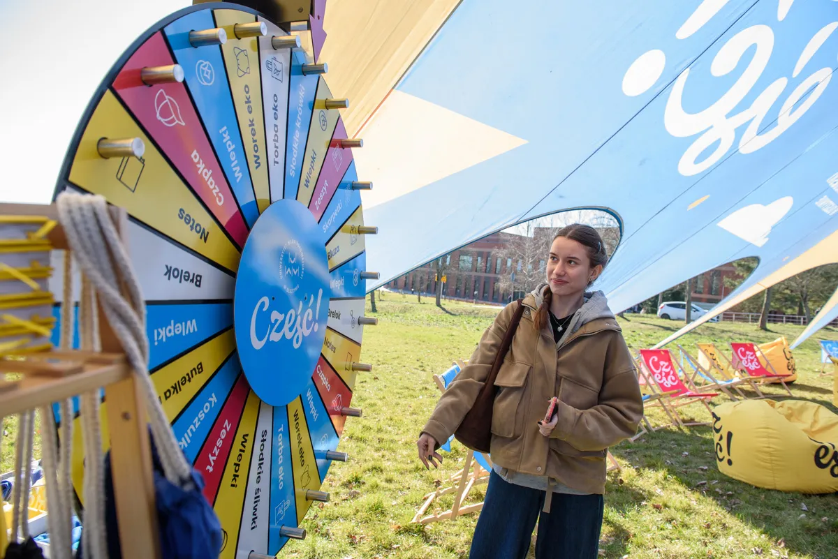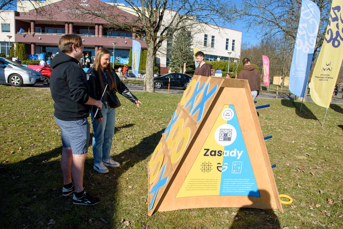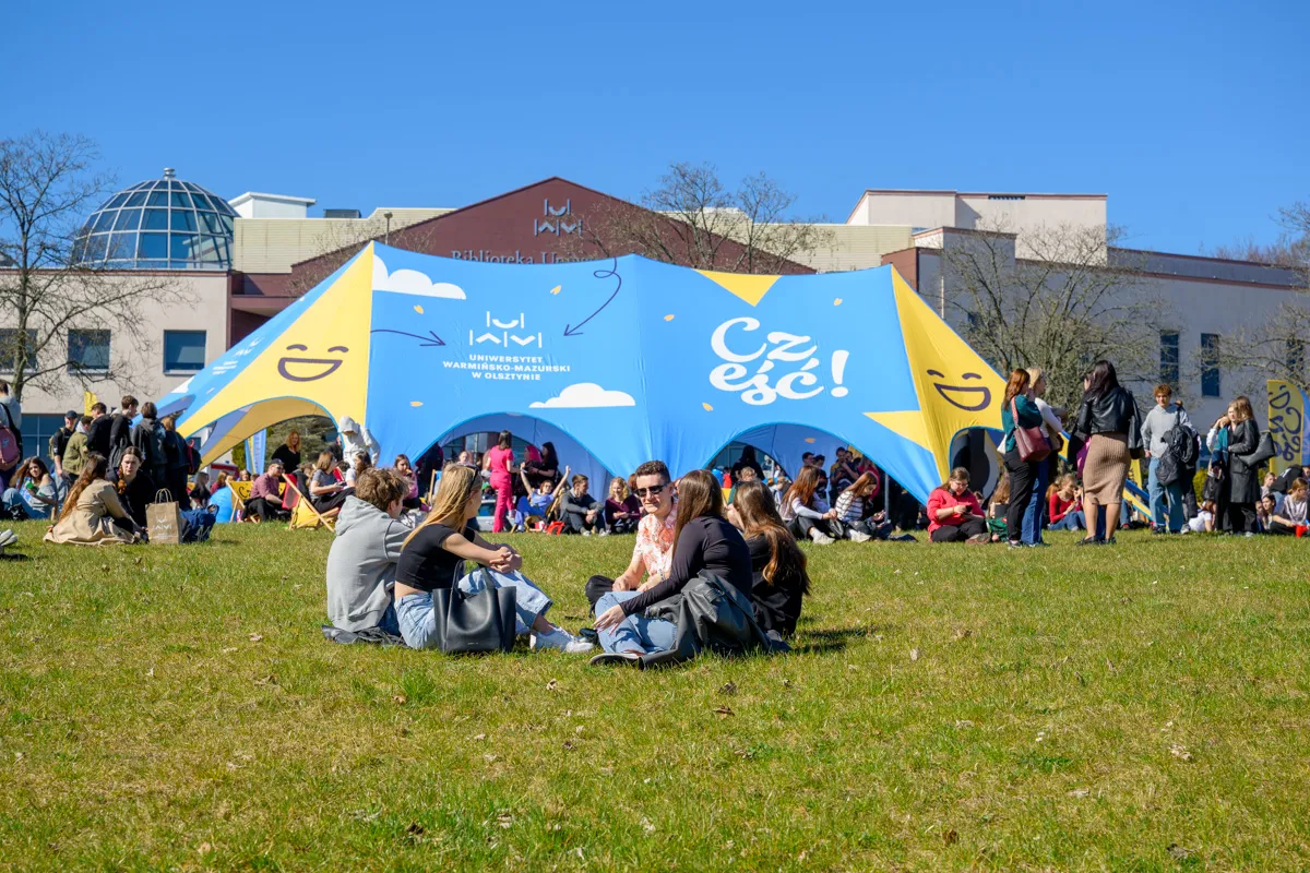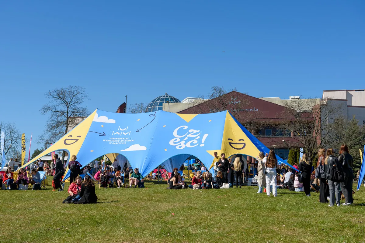 Wspaniała pogoda, która towarzyszyła tegorocznemu Dniu Otwartemu, sprzyjała także spędzaniu czasu w strefie „Cześć”. Przed budynkiem biblioteki stanął kolorowy namiot, w którym można było zakręcić kołem fortuny i wygrać nagrody, spędzić miło czas, korzystając z gier wielkoformatowych, złapać trochę oddechu i nawiązać nowe znajomości, a także… uwiecznić te dobre chwile i zabrać ze sobą zdjęcie. W plenerze odbywały się też pokazy szkolenia psów czy treningi z przedstawicielami drużyn sportowych związanych z UWM. Można było również zajrzeć do mobilnego punktu edukacyjnego „Las w szkatułce”, ambulansu z Wydziału Medycyny Weterynaryjnej czy karetki z Centrum Symulacji Medycznej Wydziału Lekarskiego.