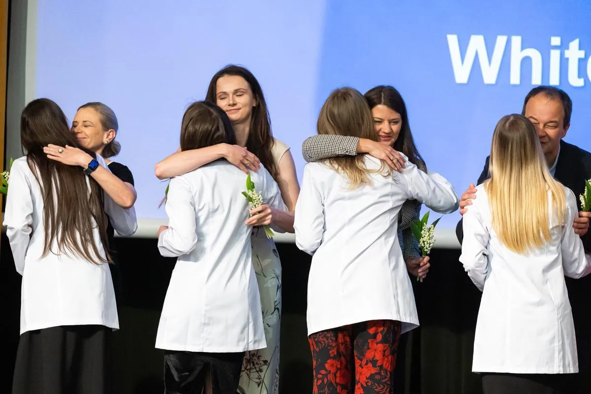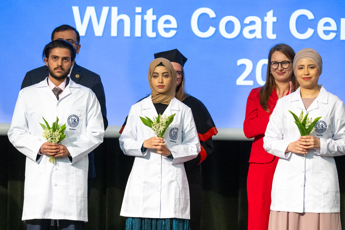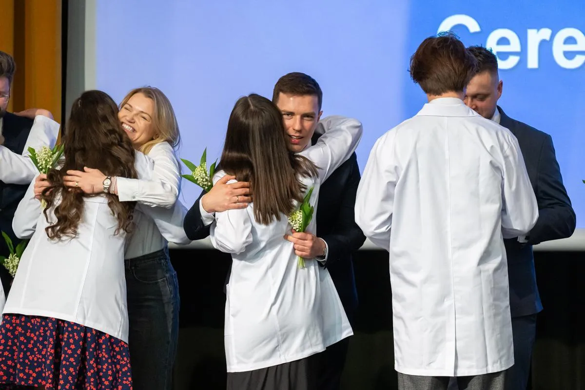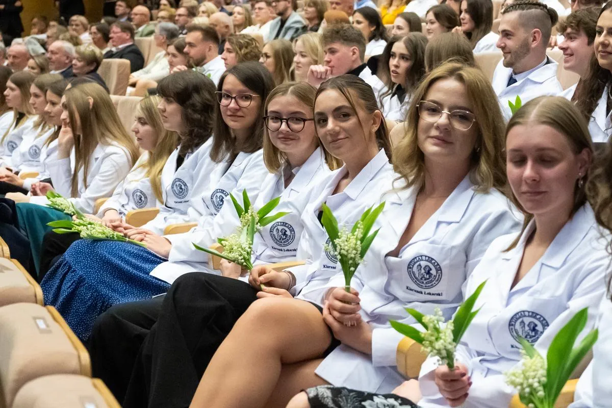 Po tych słowach nastąpiła najważniejsza część uroczystości, czyli obłóczyny. Na scenie pojawili się wszyscy studenci trzeciego roku kierunku lekarskiego, którym białe fartuchy – będące symbolem odpowiedzialności, profesjonalizmu i powołania do służby drugiemu człowiekowi – nałożyli mentorzy, czyli lekarze wykonujący praktykę lekarską i nierzadko także wykładowcy, z którymi na co dzień mają zajęcia. Każdy student otrzymał od nich również bukiet konwalii, które symbolizują delikatność, nadzieję i troskę – fundamentalne wartości dla zawodu lekarza.