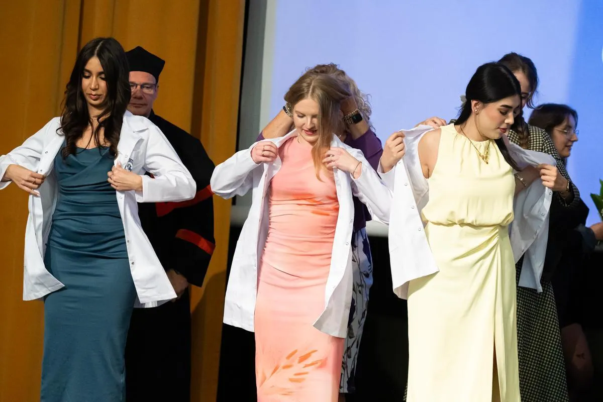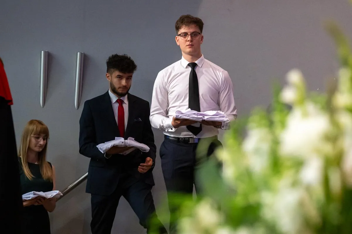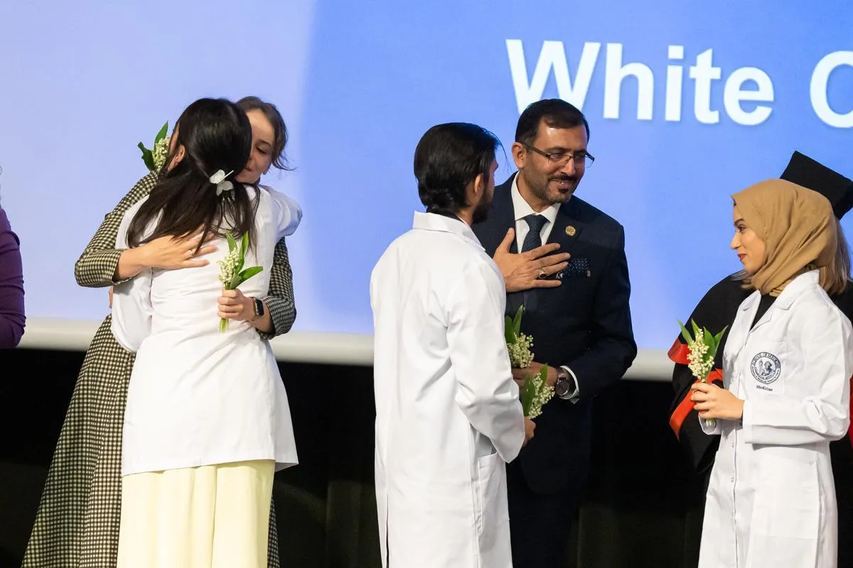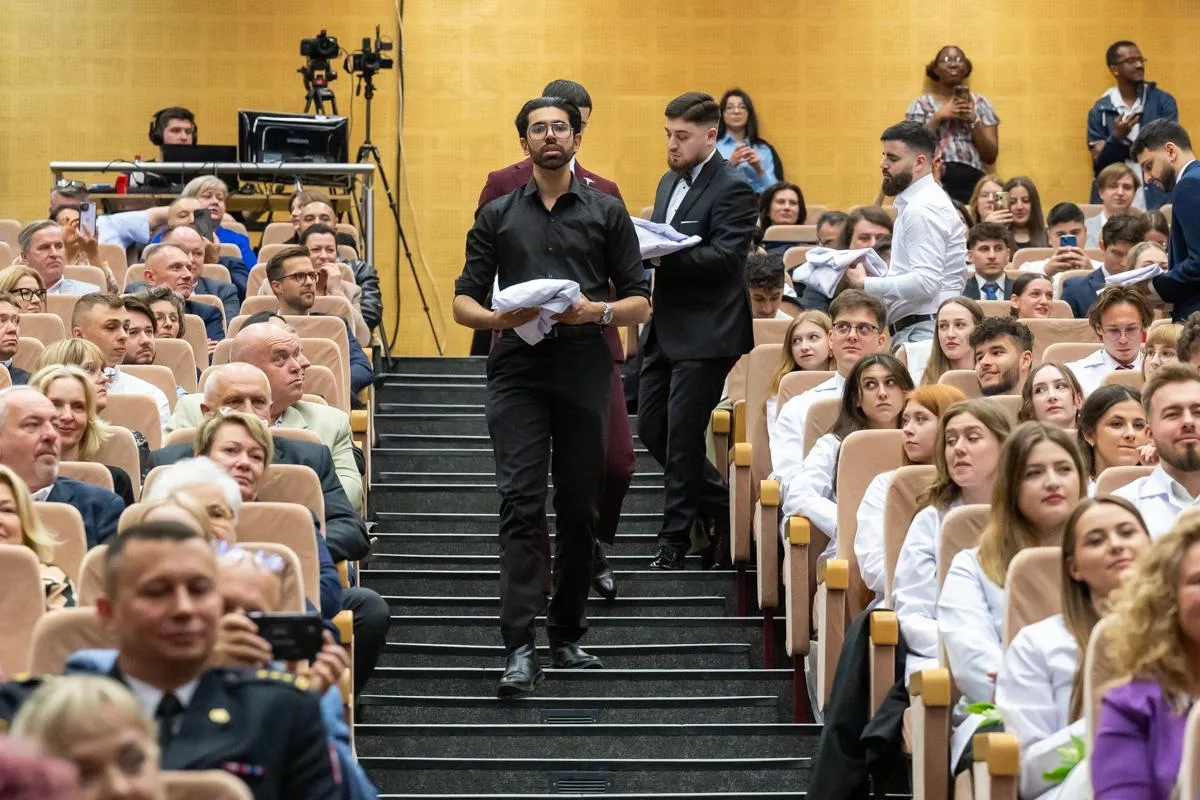 Po tych słowach nastąpiła najważniejsza część uroczystości, czyli obłóczyny. Na scenie pojawili się wszyscy studenci trzeciego roku kierunku lekarskiego, którym białe fartuchy – będące symbolem odpowiedzialności, profesjonalizmu i powołania do służby drugiemu człowiekowi – nałożyli mentorzy, czyli lekarze wykonujący praktykę lekarską i nierzadko także wykładowcy, z którymi na co dzień mają zajęcia. Każdy student otrzymał od nich również bukiet konwalii, które symbolizują delikatność, nadzieję i troskę – fundamentalne wartości dla zawodu lekarza.