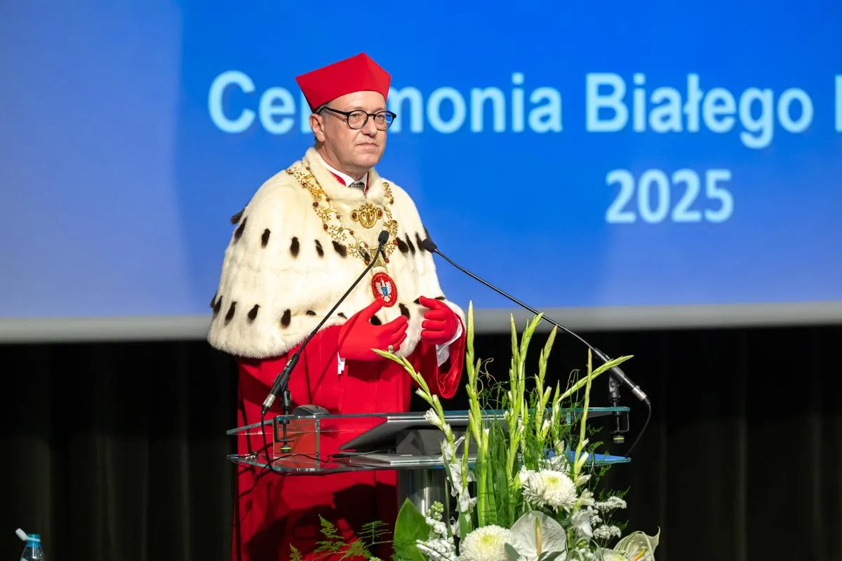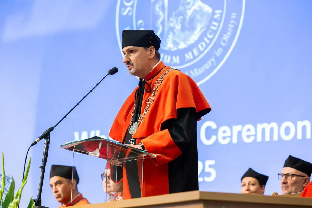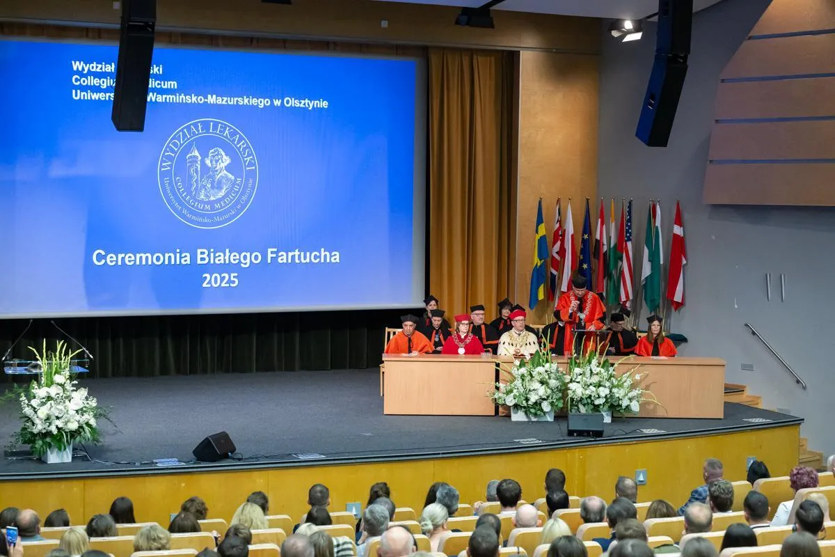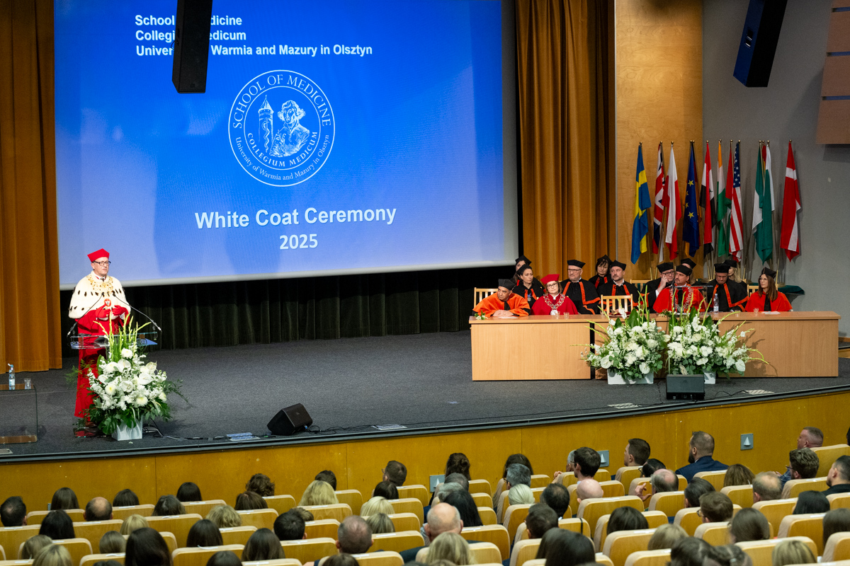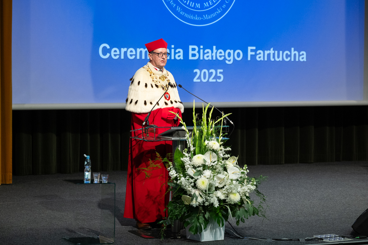 Podczas Ceremonii Białego Fartucha głos zabrał również obecny na uroczystości prof. Jerzy Przyborowski, rektor Uniwersytetu Warmińsko-Mazurskiego. W słowach skierowanych do studentów, kadry Wydziału Lekarskiego i gości, odnosząc się do procesu kształcenia i kariery zawodowej lekarzy, posłużył się metaforą budowania domu.