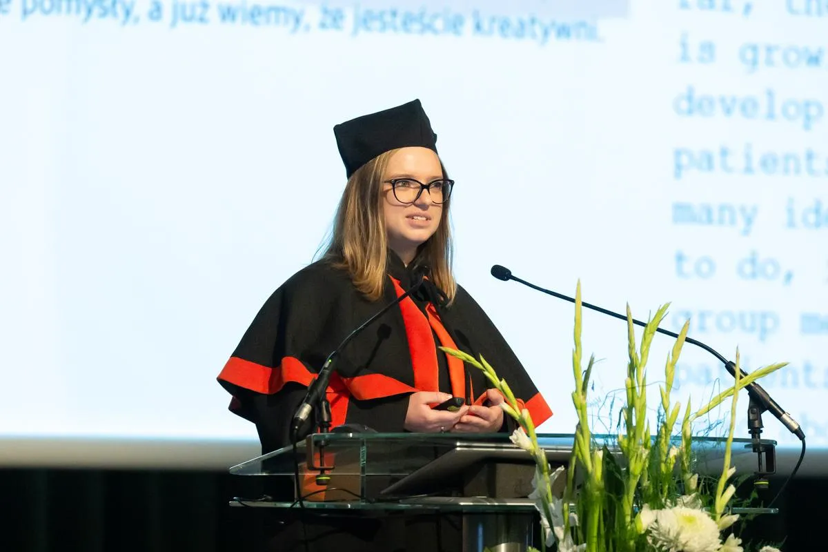 – Dziękuję naszym wykładowcom – nie tylko za ich wiedzę, ale także za cierpliwość, zwłaszcza wtedy, kiedy po raz piąty pytamy o to samo. Dziękujemy, że nie tracicie w nas wiary nawet wtedy, kiedy my zaczynamy ją tracić. Dziękujemy mentorom za wasz czas, cierpliwość i gotowość do dzielenia się wiedzą, ale także tym, czego nie da się znaleźć w podręcznikach – doświadczeniem i umiejętnością zachowania spokoju w trudnych sytuacjach. Wasza postawa inspiruje nas, abyśmy kiedyś sami stali się mentorami. Dziękujemy również naszym rodzinom, partnerom i wszystkim bliskim za mówienie „dasz radę!” i „to już prawie koniec”, które słyszymy od pierwszego dnia studiów. Dziękuję również wam, koleżanki i koledzy, za wspólne godziny nauki, wzajemną pomoc i motywację.