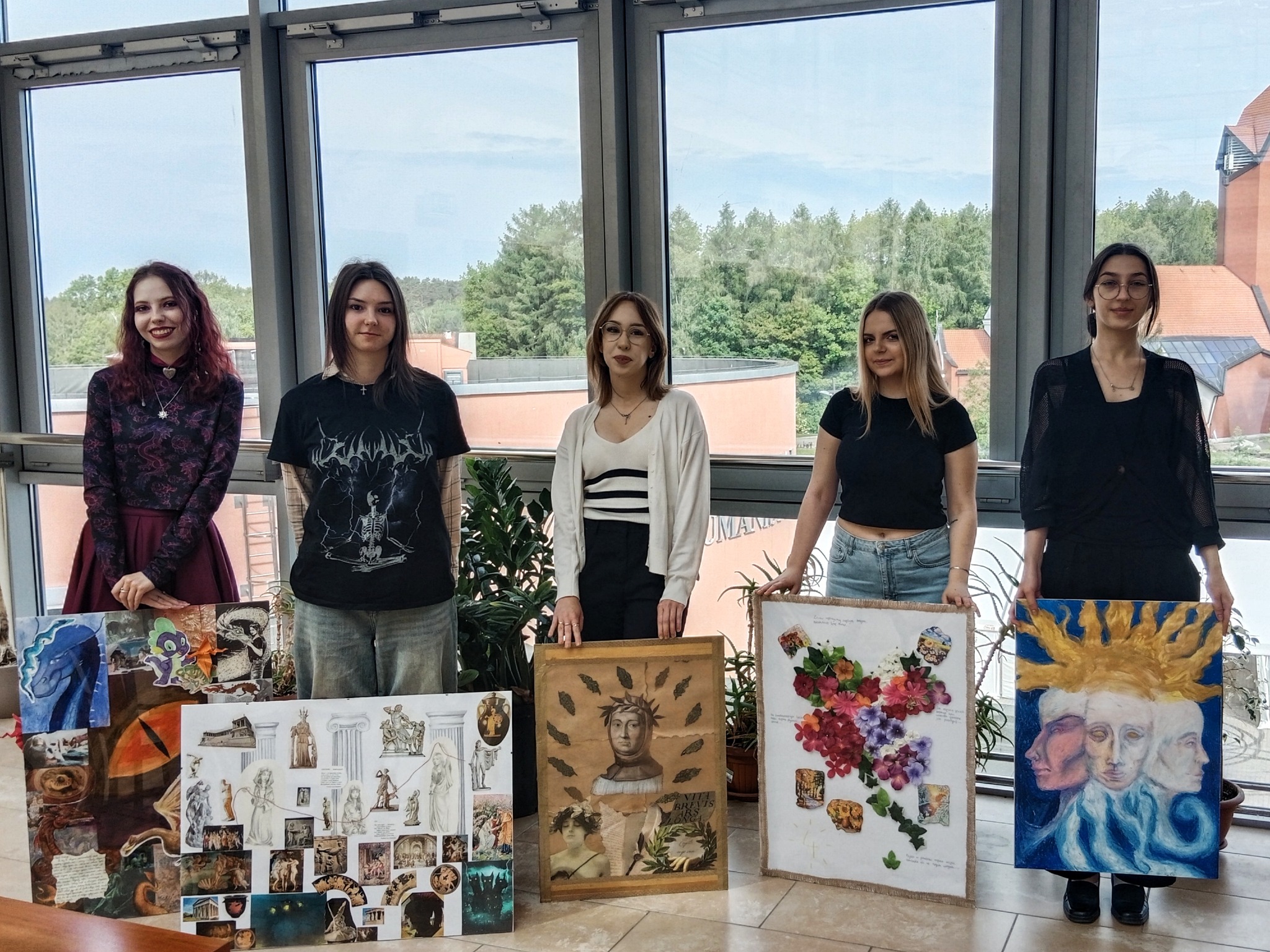O artystyczny komentarz do lektur omawianych na zajęciach poprosiła również dr Sabina Kowalczyk-Wesołowska z Katedry Literatury Polskiej. Studentki pierwszego roku studiów licencjackich stworzyły obrazy i kolaże, które aktualnie upiększają ćwiczeniową salę 264 na Wydziale Humanistycznym. Aleksandra Kowalska, Małgorzata Hajduk, Aleksandra Maciejewska, Łucja Obidzińska i Martyna Biryndo wykreowały dzieła odwołujące się m.in. do mitologii greckiej i rzymskiej, kart tarota, liczby 4, lauru i smoków. A wszystkie te twórcze działania odbywały się na przedmiocie kody kultury.