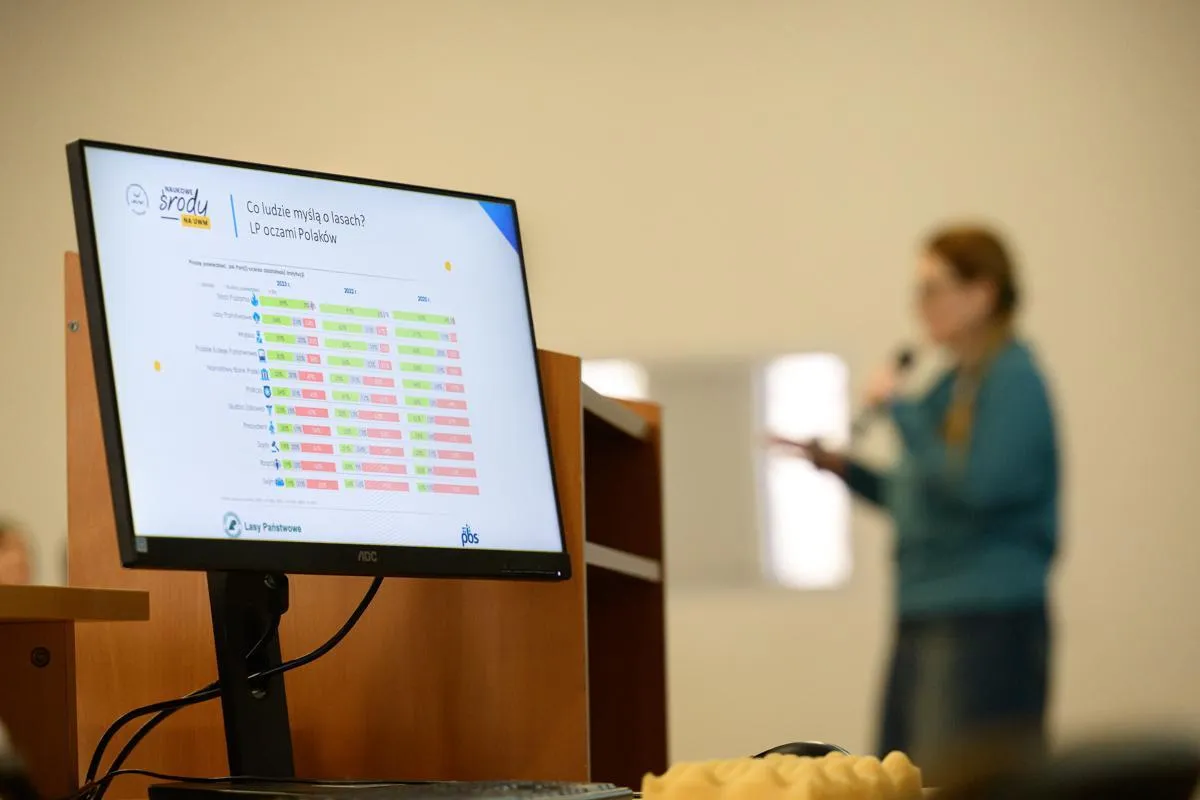 Dr inż. Małgorzata Krokowska-Paluszak jest adiunktem na Wydziale Rolnictwa i Leśnictwa. Las jest jej niezmiernie bliski i leży w kręgu jej zainteresowań naukowych, dlatego za swoją misję uważa popularyzowanie wiedzy o jego niezwykłym wpływie na człowieka i środowisko. Swój wykład rozpoczęła od przedstawienia kilka kluczowych informacji na temat lasów w Polsce. Słuchacze mieli okazję dowiedzieć się, jaki kawałek lasu przypada na jedną osobę, a także usłyszeć bardzo pozytywne informacje o tym, że w ciągu ostatnich 75 lat nastąpił znaczny wzrost w powierzchni zalesienia w Polsce. Usłyszeliśmy również dość smutną prawdę — mimo faktu, że większość Polek i Polaków mieszka w niedalekiej odległości od lasu, to 1/3 nie odwiedza go wcale.