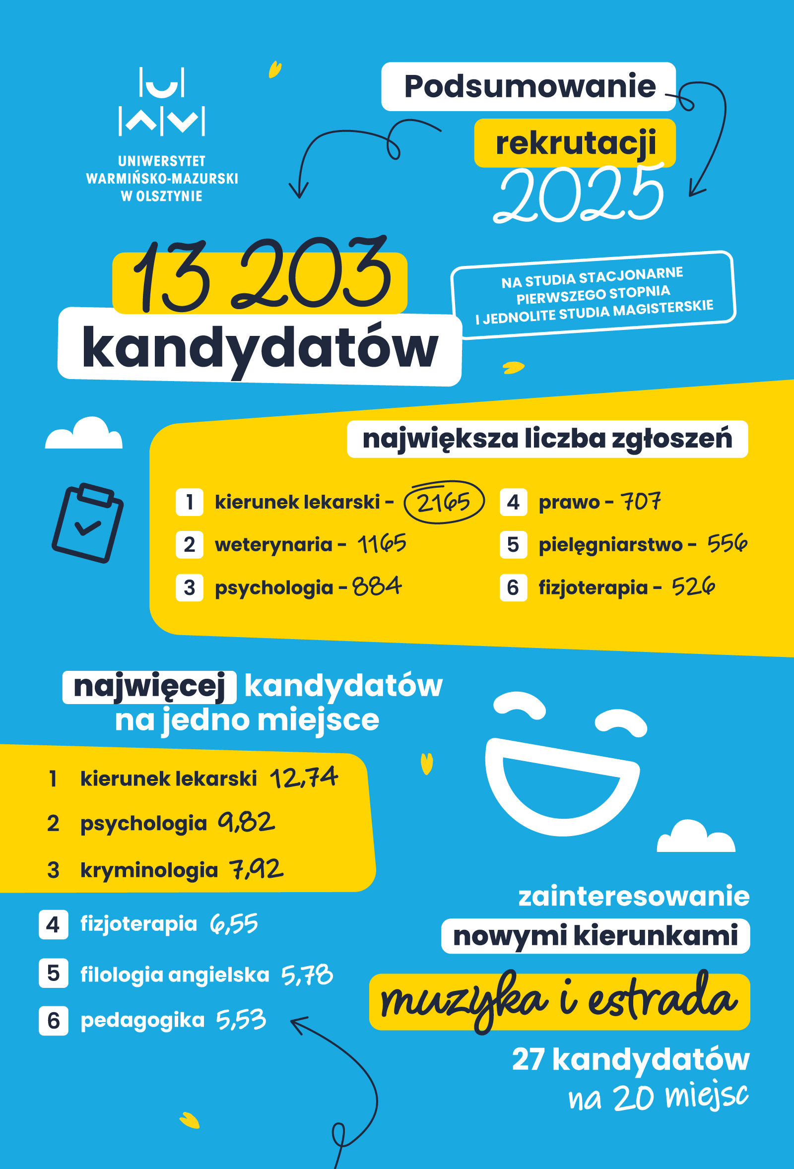 – Opłatę rekrutacyjną wniosło już 13,2 tys. osób, czyli o 600 więcej niż w ubiegłym roku i o 2 tys. więcej niż dwa lata temu! Oczywiście, nie możemy mieć pewności, że wszyscy, którzy ją opłacili, podejmą studia na naszej uczelni, ale zazwyczaj są to ci, którzy poważnie myślą o studiowaniu w Kortowie.