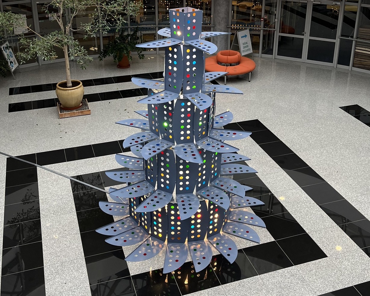 – Standardowo choinka powstawała w chaosie i oczekiwaniu. Znów pojawiła się ta myśl: nie mamy materiału! Nasz rajd po magazynach pokazał jednak, że w tym roku uda się ponownie – znaleźliśmy słynne metalowe przegródki, które miały być po prostu wyrzucone. Spróbowaliśmy więc wymyślić coś z tego materiału” – relacjonuje Elżbieta Stawska z Sekcji Promocji Biblioteki Uniwersyteckiej.
