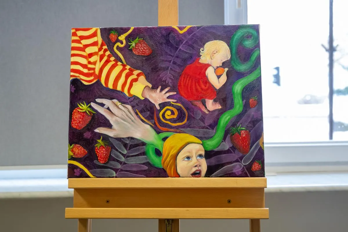 – W swoich pracach bardzo lubię używać koloru – właściwie kolor to u mnie podstawa. Do jednej z prac zainspirował mnie pierwszy oddech dziecka oraz natura, rośliny, które również oddychają, dlatego, gdy dziecko znajduje się w ich otoczeniu, to odczuwa komfort. Z kolei do scen matki karmiącej zainspirowała mnie moja córka – to, że jestem mamą. Na tym obrazie [mówiła, wskazując na jedną ze swoich prac – dop. red.] znajdują się z kolei owoce, np. truskawki, które dzieci bardzo lubią. Postanowiłam je namalować, zwłaszcza że wszystkie owoce lasu mają piękne, intensywne kolory. Ta dłoń z kolei wychodzi niejako z pępowiny, a więc jest połączona z płodem, co symbolizuje łączność matki z dzieckiem – wyjaśniała.
