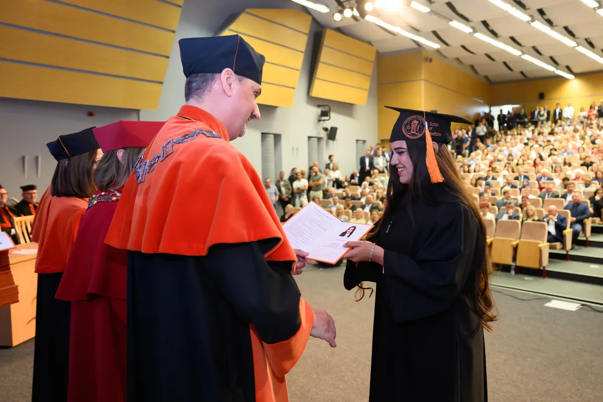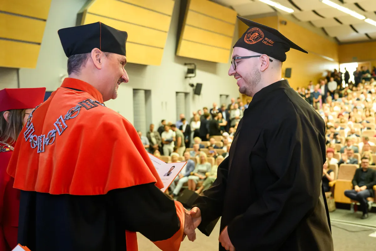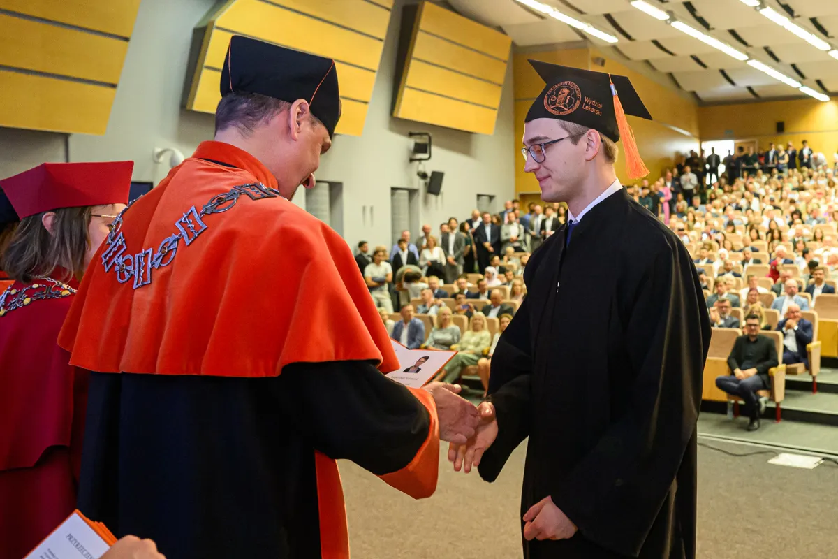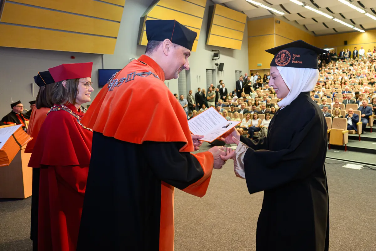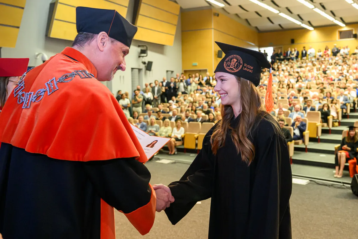 – Na pierwszym roku siedzieliśmy tutaj pełni niepokoju przed kolejną wejściówką z anatomii. Od tego czasu spędziliśmy ponad 6000 godzin na zajęciach, a drugie tyle, jeżeli nie więcej, na nauce, konferencjach, dyżurach, kołach naukowych, wydarzeniach sportowych i artystycznych. Przeżyliśmy pandemię, powódź, początki wojen i egzamin ustny z fizjologii. I daliśmy sobie radę. Dziś znów siedzimy tutaj z wdzięcznością za minione lata, jedynie z niepokojem o przyszłość, ale wierzę, że każdy z nas już wie, że sobie poradzimy – mówiła Katarzyna Bednarczuk po czym podziękowała wykładowcom, asystentom, nauczycielom akademickim, opiekunowi roku, pracownikom administracji, a także najbliższym. – Te studia wymagały od nas nie tylko wiedzy i systematyczności, ale też ogromnej siły charakteru. Mimo wszystkich trudności dotarliśmy tutaj razem. Każdy z nas jest dzisiaj silniejszy, mądrzejszy i bardziej gotowy, by wyjść naprzeciw kolejnych wyzwaniom. Dajmy sobie teraz chwilę, by spojrzeć z dumą na to, co osiągnęliśmy, bo naprawdę jest z czego być dumnym. Niech nasza praca przynosi radość, rozwój i spełnienie, nie tylko nam, ale też naszym przyszłym pacjentom. Z całego serca nam wszystkim gratuluję oraz dziękuję za te wspólne lata. Niech ten dzień będzie raczej dobrym początkiem niż smutnym końcem.