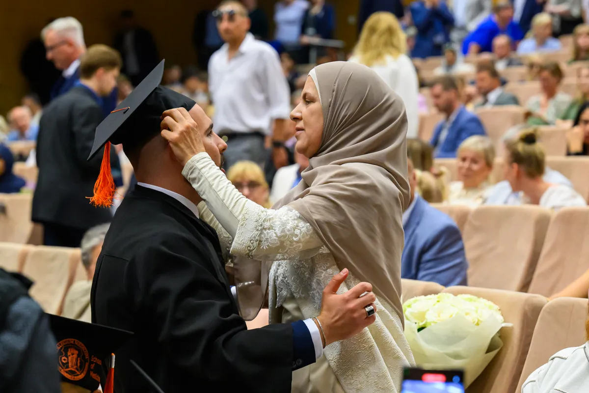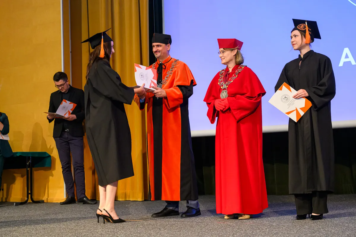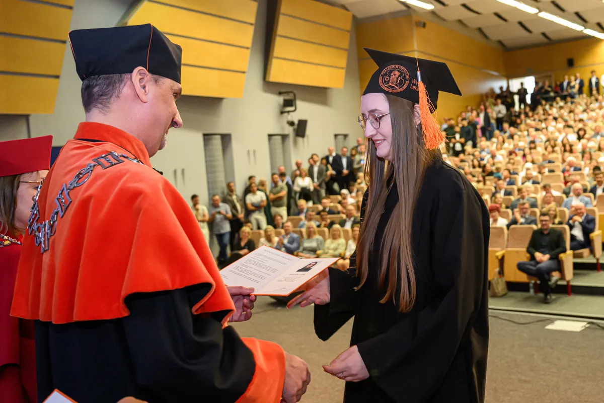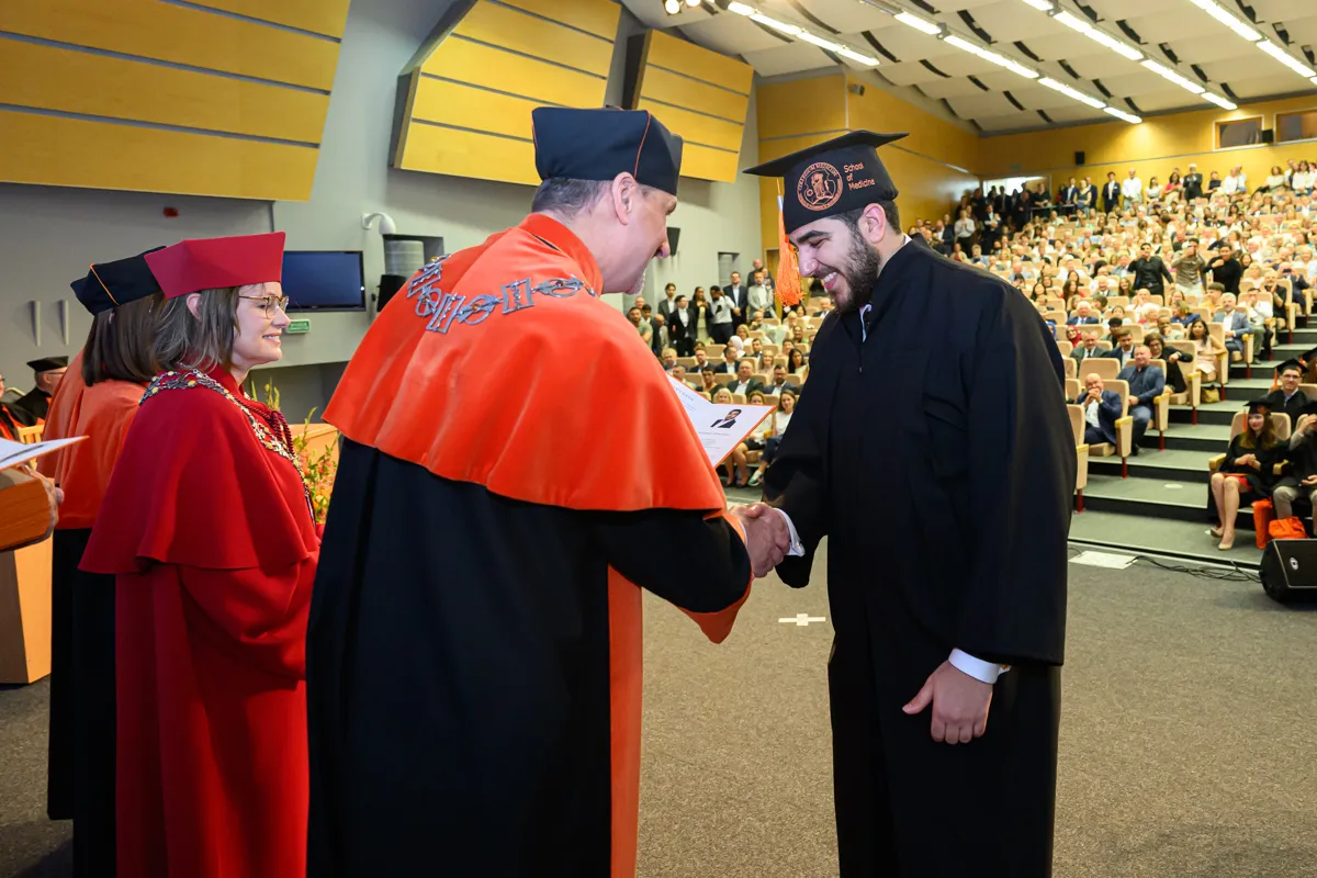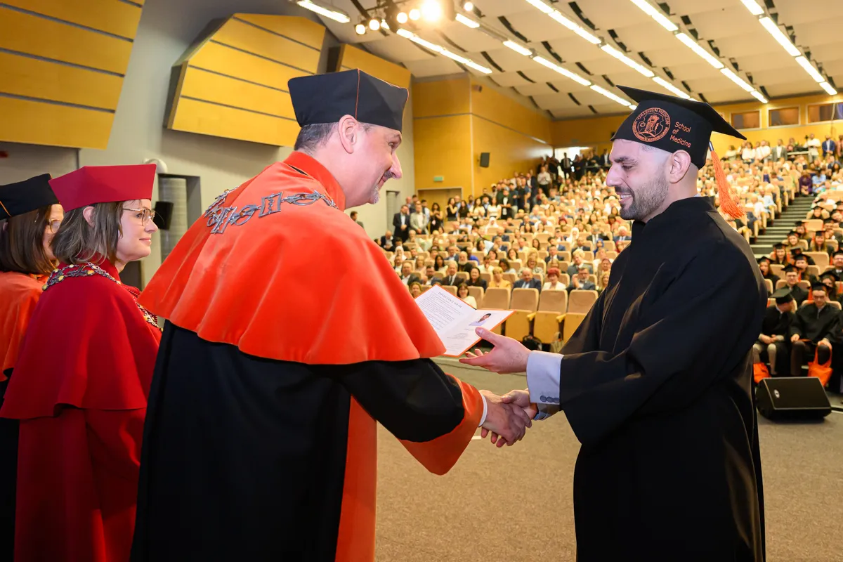 – Na pierwszym roku siedzieliśmy tutaj pełni niepokoju przed kolejną wejściówką z anatomii. Od tego czasu spędziliśmy ponad 6000 godzin na zajęciach, a drugie tyle, jeżeli nie więcej, na nauce, konferencjach, dyżurach, kołach naukowych, wydarzeniach sportowych i artystycznych. Przeżyliśmy pandemię, powódź, początki wojen i egzamin ustny z fizjologii. I daliśmy sobie radę. Dziś znów siedzimy tutaj z wdzięcznością za minione lata, jedynie z niepokojem o przyszłość, ale wierzę, że każdy z nas już wie, że sobie poradzimy – mówiła Katarzyna Bednarczuk po czym podziękowała wykładowcom, asystentom, nauczycielom akademickim, opiekunowi roku, pracownikom administracji, a także najbliższym. – Te studia wymagały od nas nie tylko wiedzy i systematyczności, ale też ogromnej siły charakteru. Mimo wszystkich trudności dotarliśmy tutaj razem. Każdy z nas jest dzisiaj silniejszy, mądrzejszy i bardziej gotowy, by wyjść naprzeciw kolejnych wyzwaniom. Dajmy sobie teraz chwilę, by spojrzeć z dumą na to, co osiągnęliśmy, bo naprawdę jest z czego być dumnym. Niech nasza praca przynosi radość, rozwój i spełnienie, nie tylko nam, ale też naszym przyszłym pacjentom. Z całego serca nam wszystkim gratuluję oraz dziękuję za te wspólne lata. Niech ten dzień będzie raczej dobrym początkiem niż smutnym końcem.
