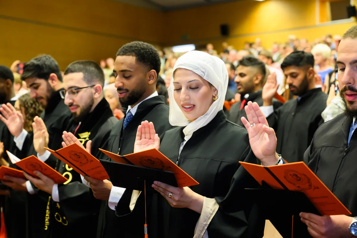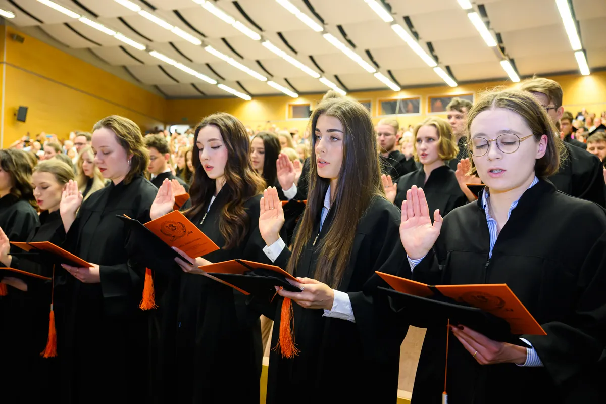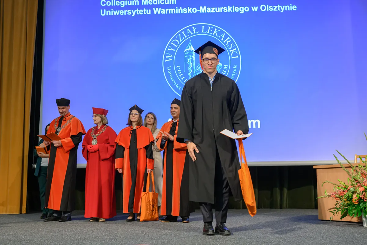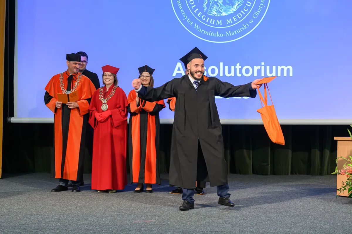 Po przemówieniu dziekana absolwenci odebrali karty absolutoryjne i otrzymali gromkie owacje na stojąco. Następnie złożyli przyrzeczenie lekarskie. Tę część uroczystości poprowadzili: dr Piotr Kocbach, członek prezydium Okręgowej Rady Lekarskiej Warmińsko-Mazurskiej Izby Lekarskiej w Olsztynie (studia w j. polskim) oraz dr n. med. Rakesh Jalali, prodziekan ds. studentów anglojęzycznych i rozwoju (studia w j. angielskim).