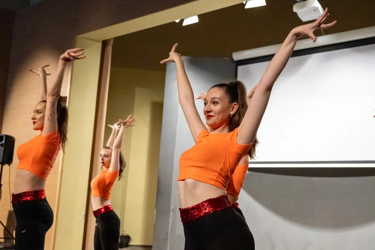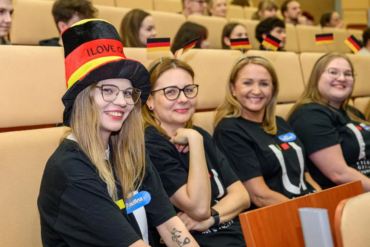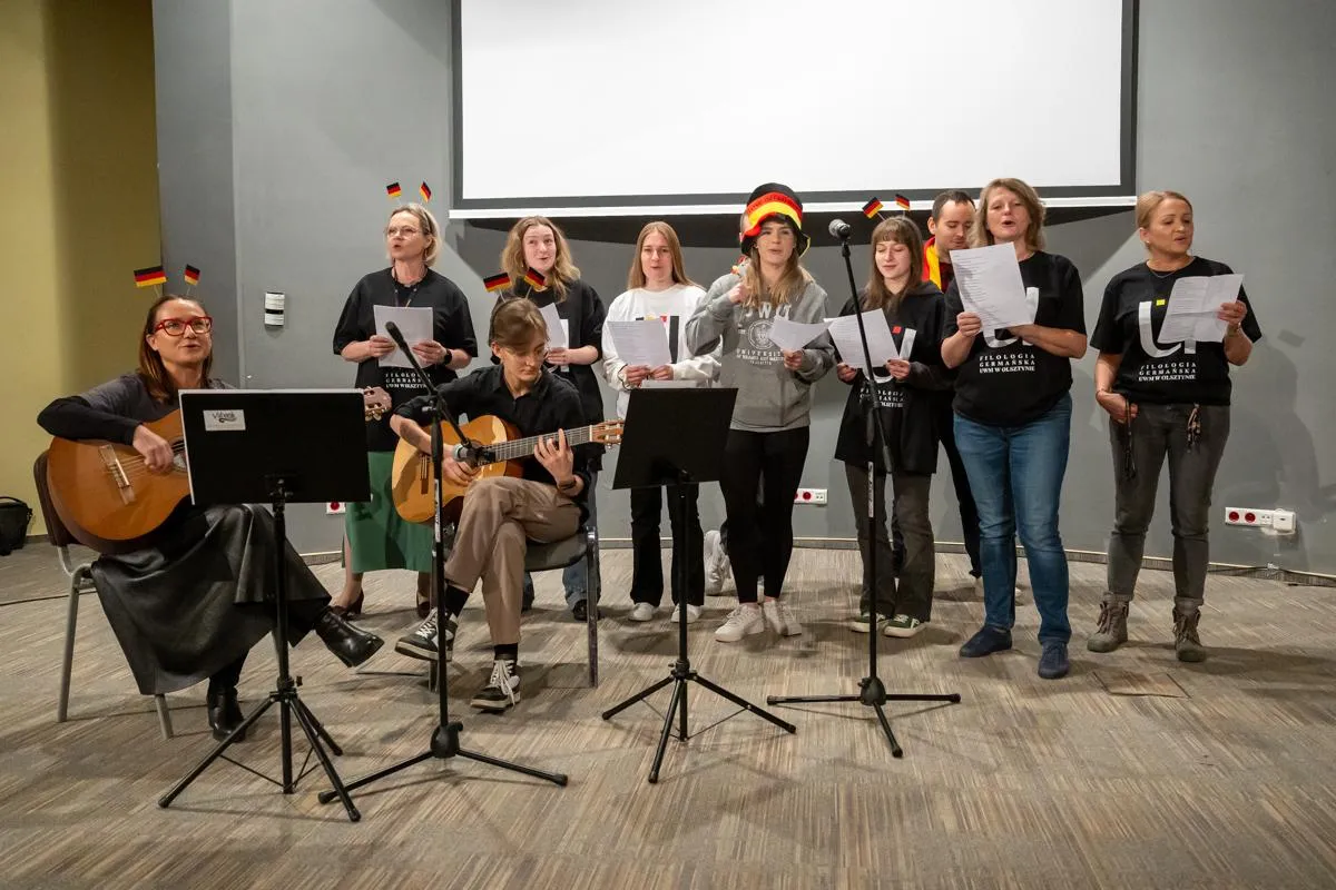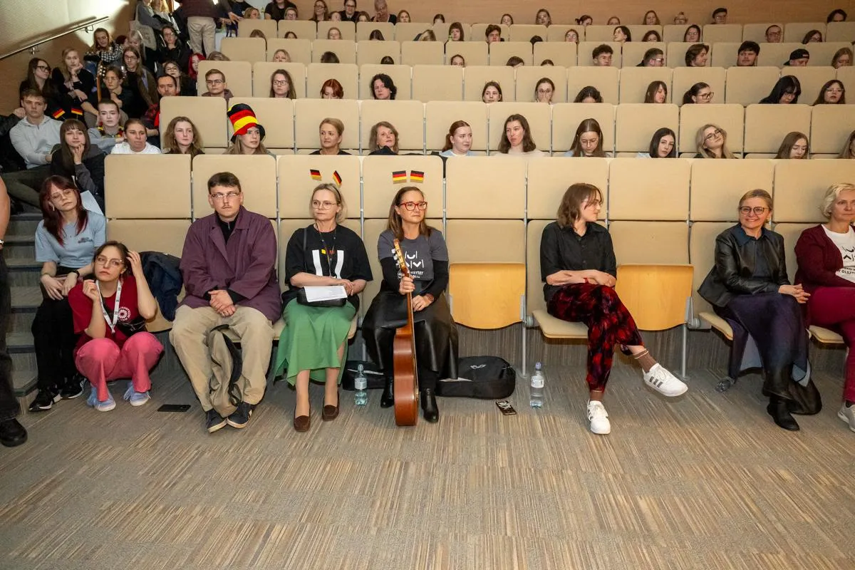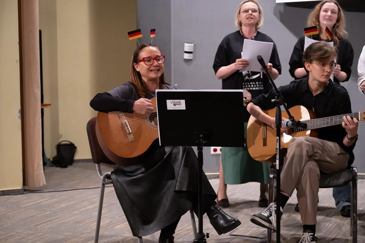 Po debacie w Auli Teatralnej odbyły się występy artystyczne, które rozgrzały wszystkich zawiedzionych kapryśną i chłodną majową pogodą. Gdy na scenie pojawiła się „Endorfina” – sekcja tańca Studium Wychowania Fizycznego i Sportu UWM – i zatańczyła do gorącej hiszpańskiej piosenki „La Cintura” Alvaro Solera, padający za oknem deszcz przestał mieć znaczenie. Za gitarę chwyciła nawet dr hab. Aneta Jachimowicz, prof. UWM, prodziekan ds. kształcenia i germanistka. I stało się to nie bez powodu – germaniści z UWM obchodzą w tym roku jubileusz.