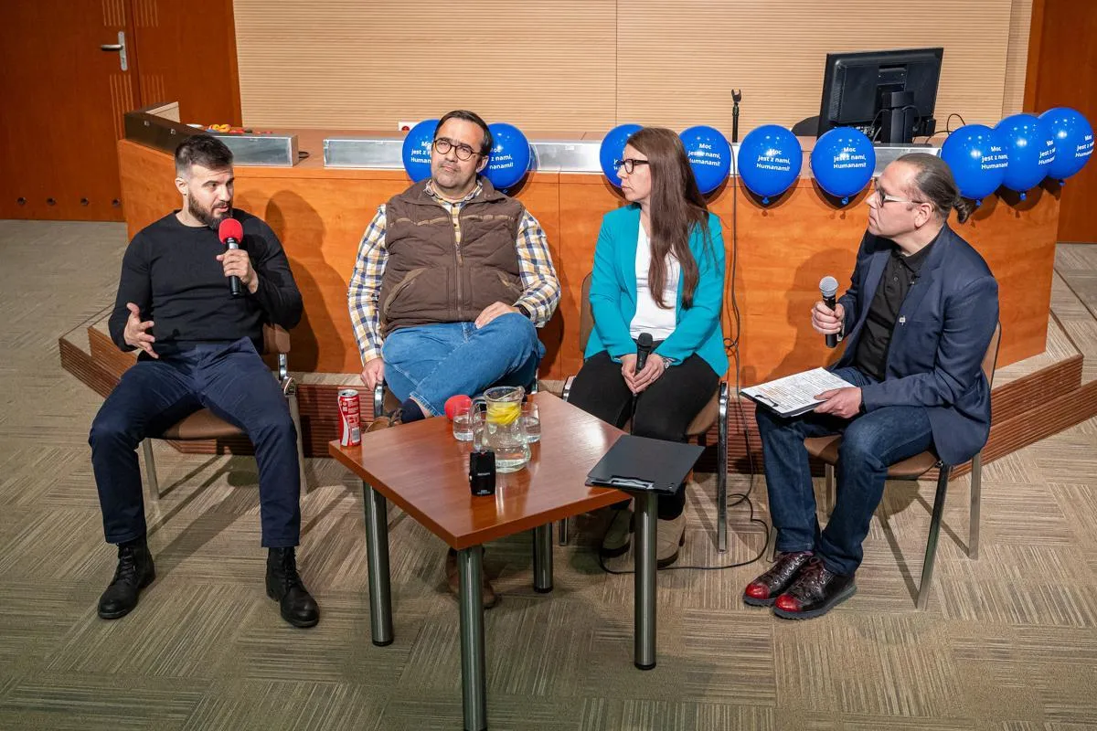 Drugi dzień obchodów XVII Dni Humana rozpoczęła debata z cyklu „Human w digitalu”, którego celem jest inspirowanie do dyskusji o roli, znaczeniu i funkcjach coraz nowszych mediów cyfrowych i mobilnych, otaczających nas i angażujących niemal bez reszty. W poprzednich dwóch edycjach rozmawiano o sztucznej inteligencji oraz o kompetencjach 4.0. Tym razem publiczność zgromadzona w Auli Dietrichów wysłuchała dyskusji na temat gier wideo (nie) dla rozrywki. W roli ekspertów wystąpili: dr Miłosz Babecki (medioznawca, badacz gier wideo, twórca podcastu „Metaphor Games"), dr Grzegorz Kała (pracownik Instytutu Historii UWM, badacz historii dwudziestolecia międzywojennego i historii wojskowości, analizujący wykorzystanie gier do tworzenia symulacji militarnych), dr Martyna Kotyśko (psycholożka z Wydziału Nauk Społecznych UWM, realizatorka projektów badawczych dotyczących m.in. mediów społecznościowych, gier hazardowych, gier wideo oraz treningu odporności psychicznej z wykorzystaniem VR) oraz dr Marek Maruszczak (językoznawca, projektant gier, autor książek pt. „Głupie ptaki Polski (...)”, „Głupie zwierzęta Polski (...)” oraz „Sally. Trudno być wiedźmą”).