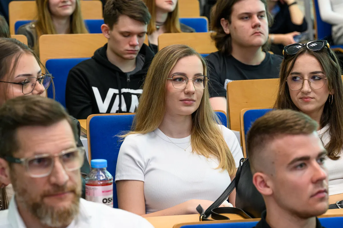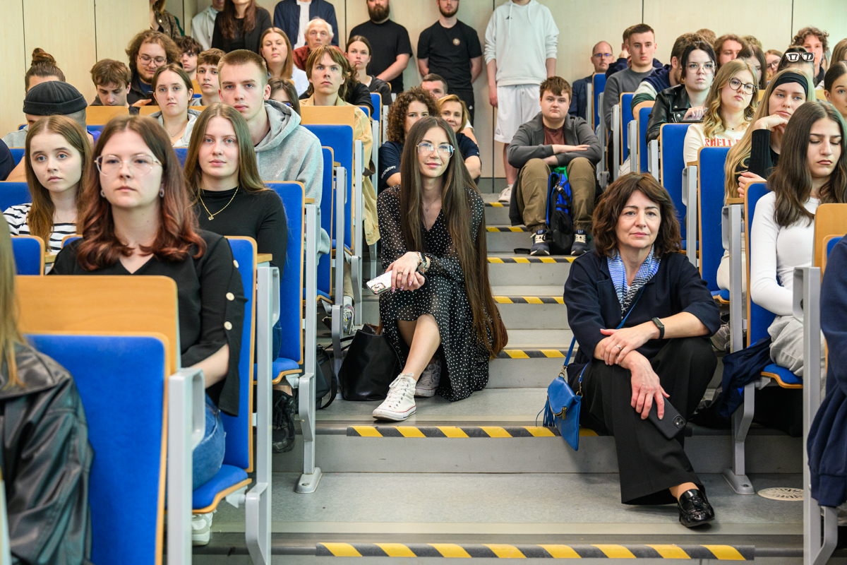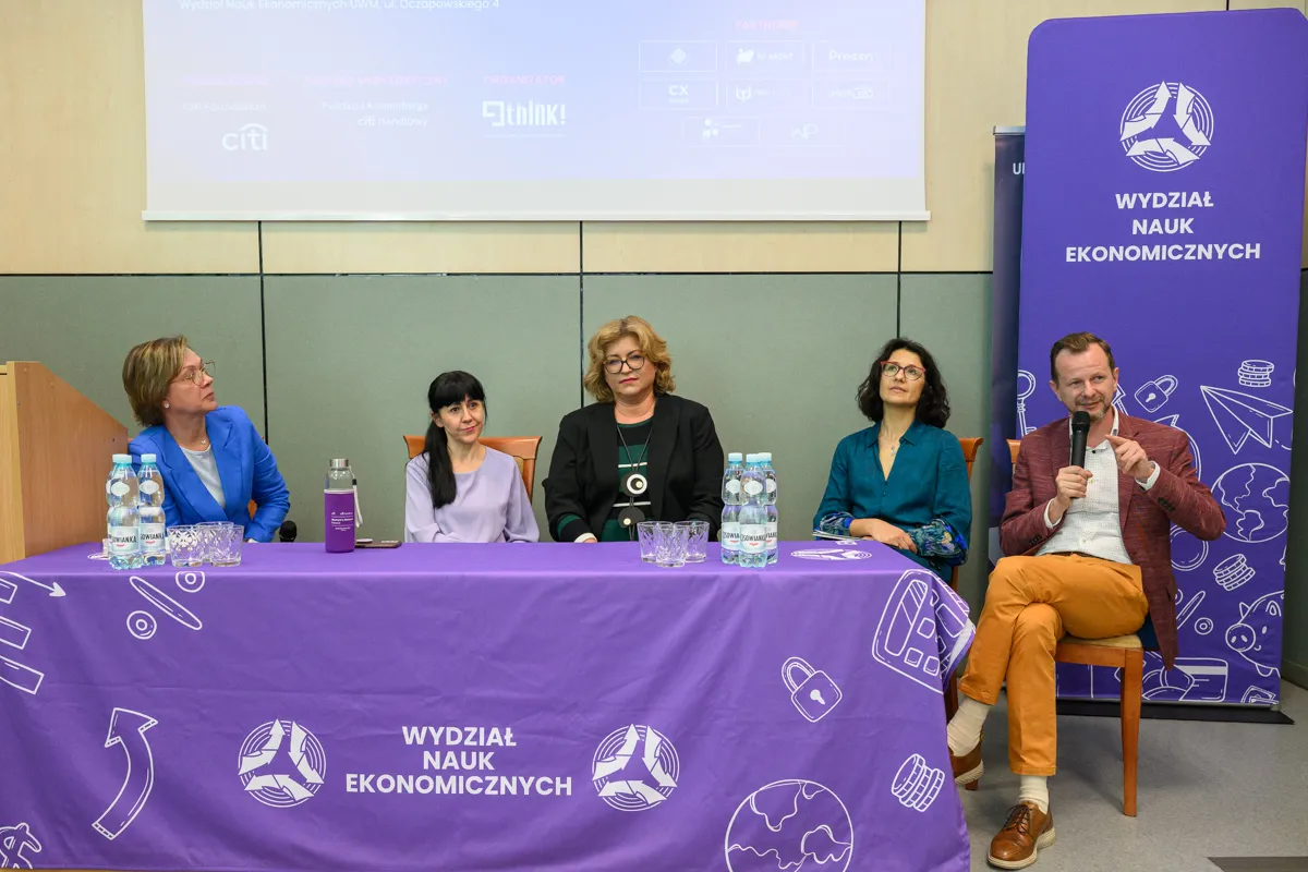 – Bardzo mnie cieszy to, że widzę tak liczną publiczność w auli Wydziału Nauk Ekonomicznych. Spotkaliśmy się, aby porozmawiać o przyszłości. Żyjemy w bardzo dynamicznych czasach, w bardzo turbulentnym otoczeniu i musimy sobie zadawać pytania, co dalej z rynkiem pracy, przedsiębiorczością, karierą zawodową, jak te ścieżki rysować na różnych etapach. Jestem przekonany, że dzisiejsze spotkanie sprowokuje was do zastanowienia się i być może zaplanowania swojej przyszłości i kariery zawodowej w trochę inny sposób – mówił do osób uczestniczących w wydarzeniu dr Tomasz Wierzejski, prodziekan ds. kształcenia WNE.