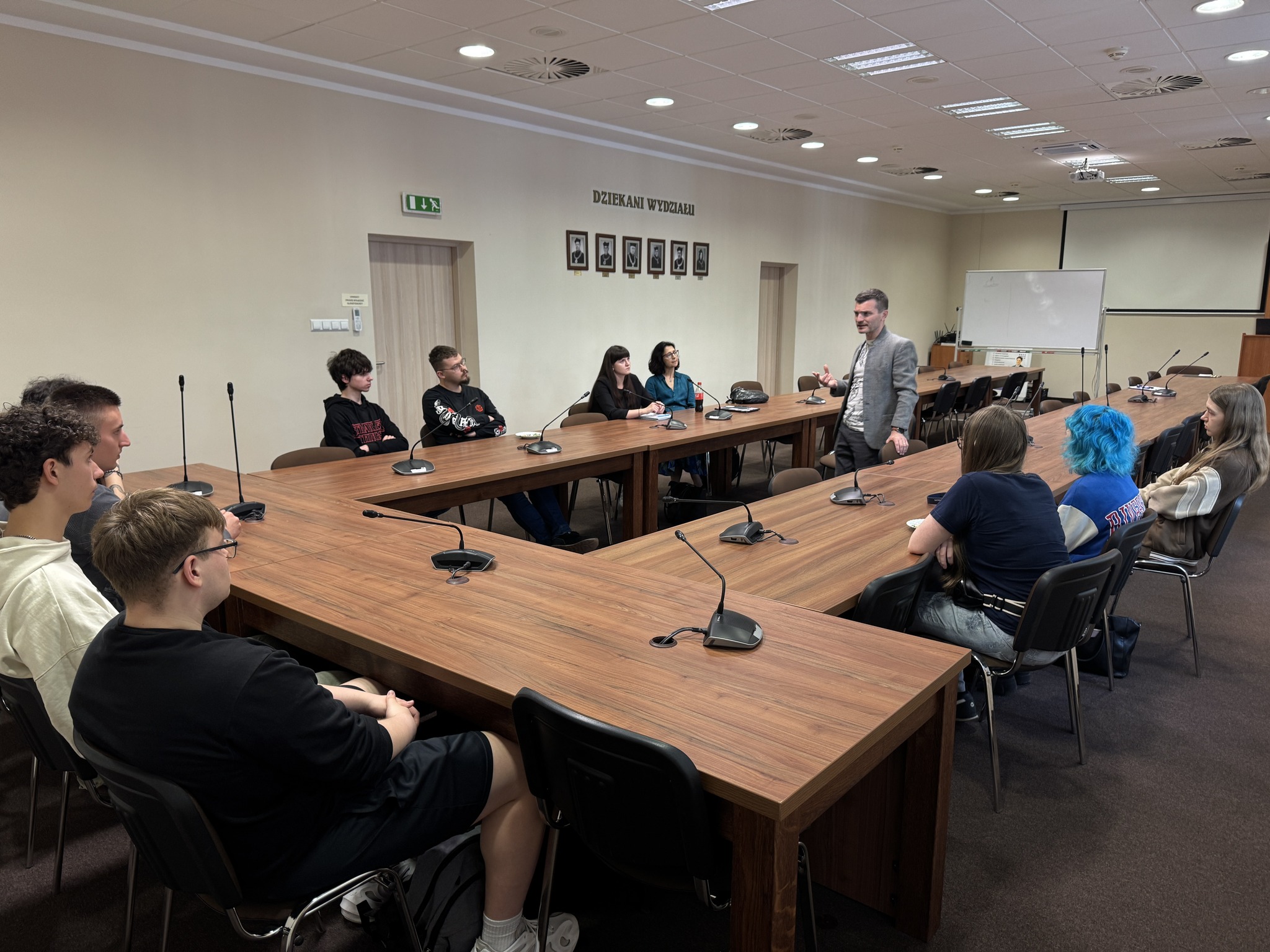 Paweł Grzesik, coach, trener i aktor poprowadził dla studentów warsztaty pitchingu, podczas których mówił o tym, jak skutecznie prezentować siebie przed różnego rodzaju interesariuszami, pracodawcami, klientami czy inwestorami.