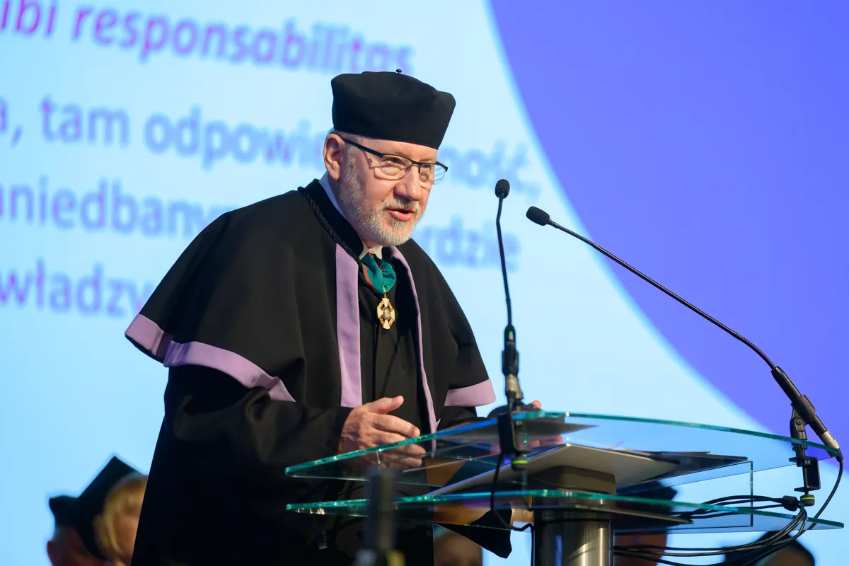Rektor apelował o to, by poczucie odpowiedzialności za działania i decyzje kształtowane było także u tych, którzy w murach uczelni wyposażani są w wiedzę i umiejętności. Przypomniał, że misją Uniwersytetu jest kształcenie ludzi myślących, wrażliwych i gotowych, by zmieniać świat na lepsze.