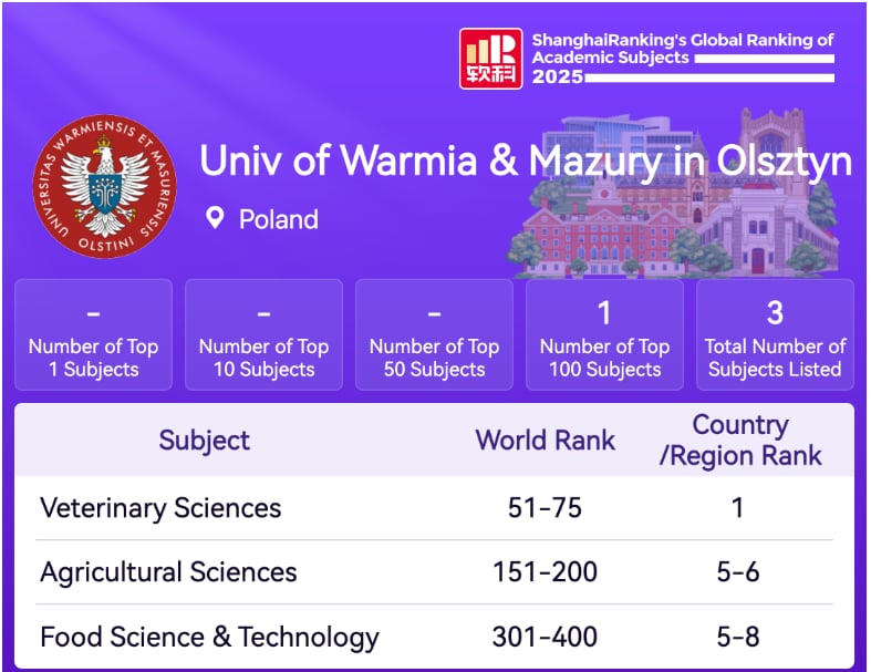 Wśród najlepiej ocenianych dyscyplin reprezentowanych na Uniwersytecie Warmińsko-Mazurskim w Olsztynie po raz kolejny znalazła się kortowska weterynaria. Potwierdziła ona swoją wysoką pozycję i udowodniła, że naukowcy z Uniwersytetu Warmińsko-Mazurskiego są wyjątkowymi ekspertami w tej dyscyplinie. Trzy lata temu nauki weterynaryjne na UWM zajęły miejsce w przedziale 151-200, dwa lata temu – 101-150, a rok temu i obecnie – 51-75. Wydział Medycyny Weterynaryjnej UWM wyprzedza tym samym inne polskie jednostki kształcące w tej dyscyplinie. Na czele stawki GRAS 2025 są trzy chińskie uczelnie: Yangzhou University, China Agricultural University oraz Nanjing Agricultural University.