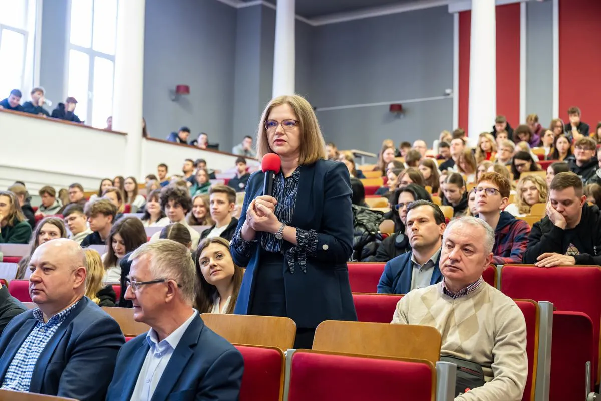 Pracownicy i studenci wydziału oraz młodzież pytali m.in. o finansowanie programu SAFE, skutki obniżenia cen paliw, politykę fiskalną i narzędzia finansowania pozabudżetowego.