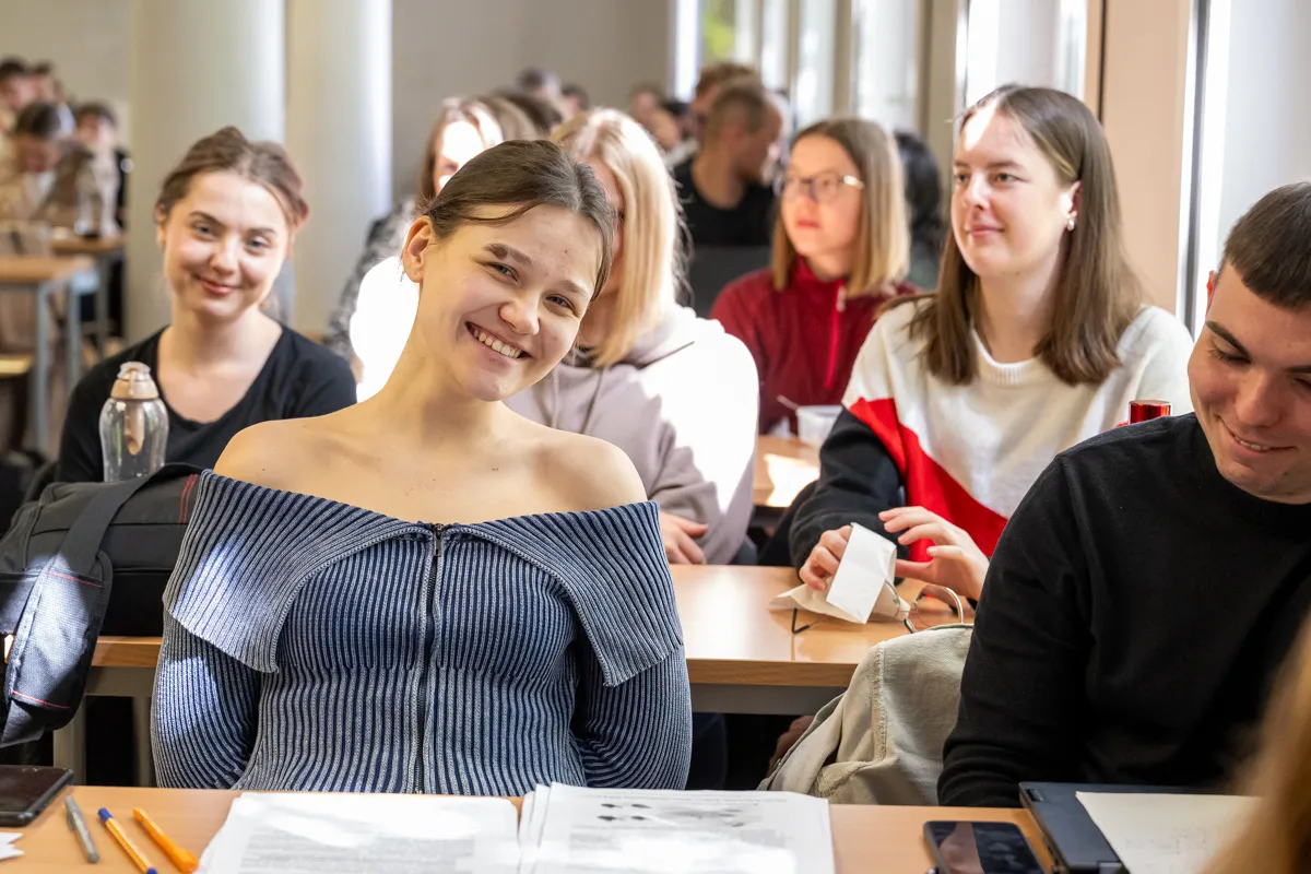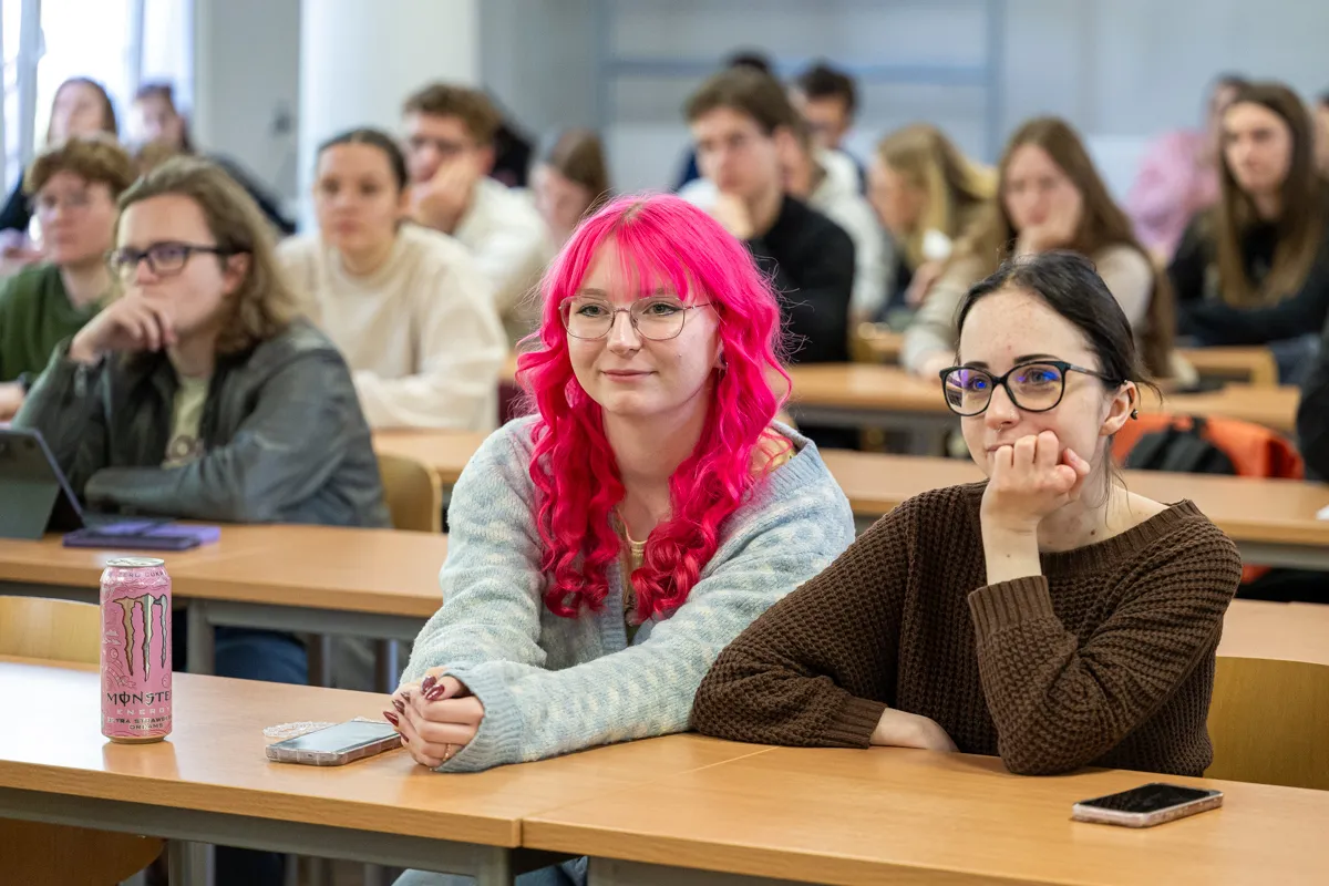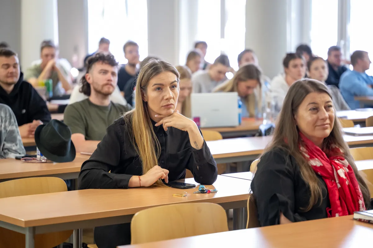 Studenci w trakcie seminarium „Zawodowy Kompas WBZ” są zwolnieni z zajęć dydaktycznych i aktywnie uczestniczą w spotkaniu. Zadają prelegentom pytania o staże, praktyki i możliwości pracy zawodowej.