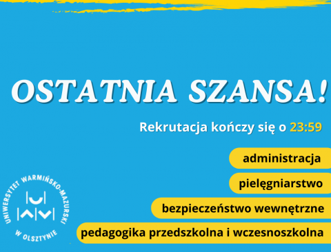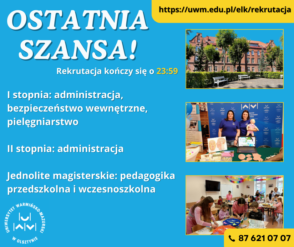 Dziś, 16 września 2025 r., kończy się II tura rekrutacji do Filii Uniwersytetu Warmińsko-Mazurskiego w Ełku. Do godziny 23:59 rejestrujemy ostatnich kandydatów, którzy chcą rozpocząć swoją akademicką przygodę w roku akademickim 2025/2026.