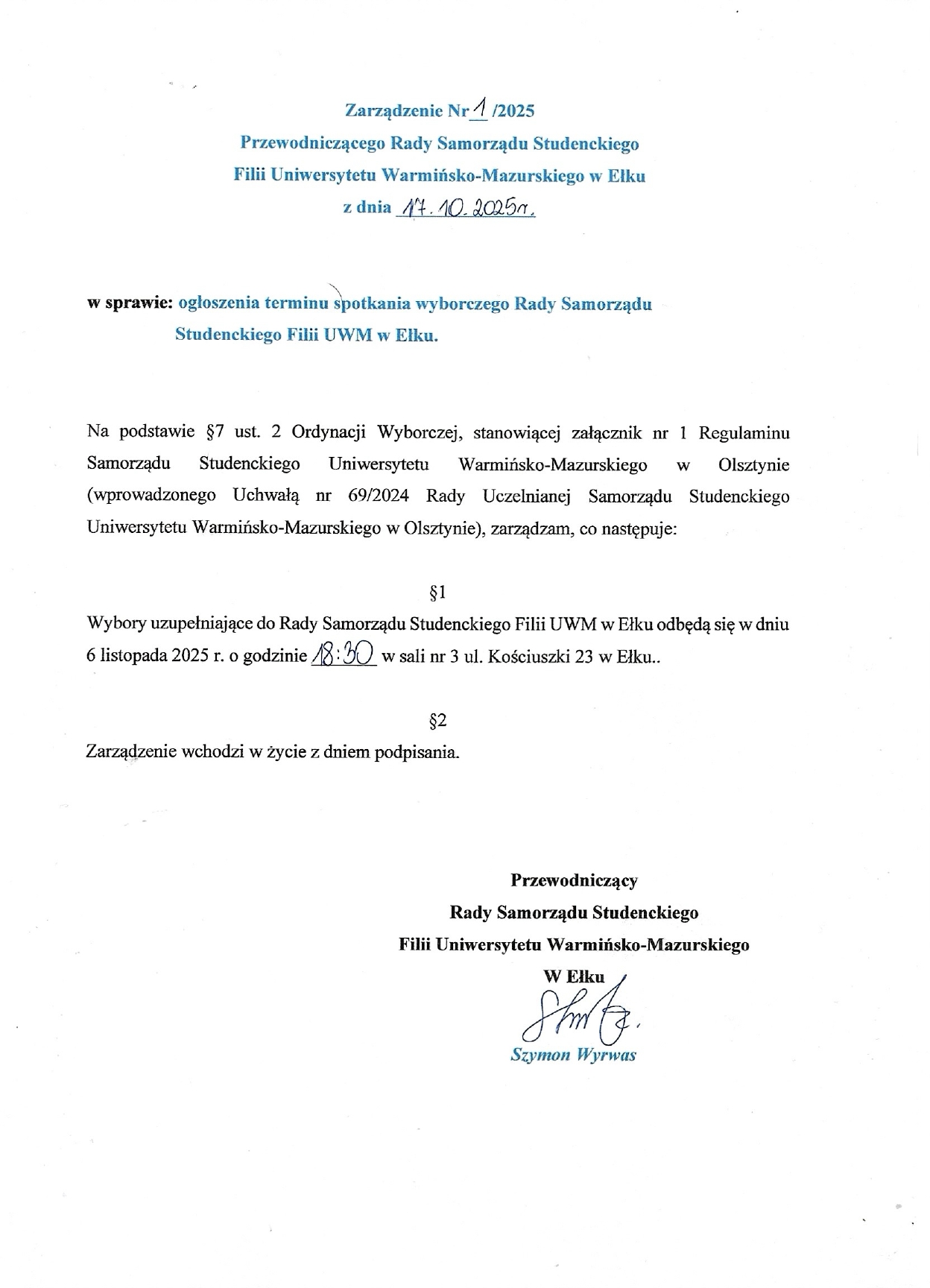 Spotkanie wyborcze Rady Samorządu Studenckiego Filii UWM w Ełku Wybory uzupełniające do Rady Samorządu Studenckiego Filii UWM w Ełku odbędą się w dniu 6 listopada 2025r. o godz. 18:30 w sali nr 3 ul. Kościuszki 23 w Ełku.