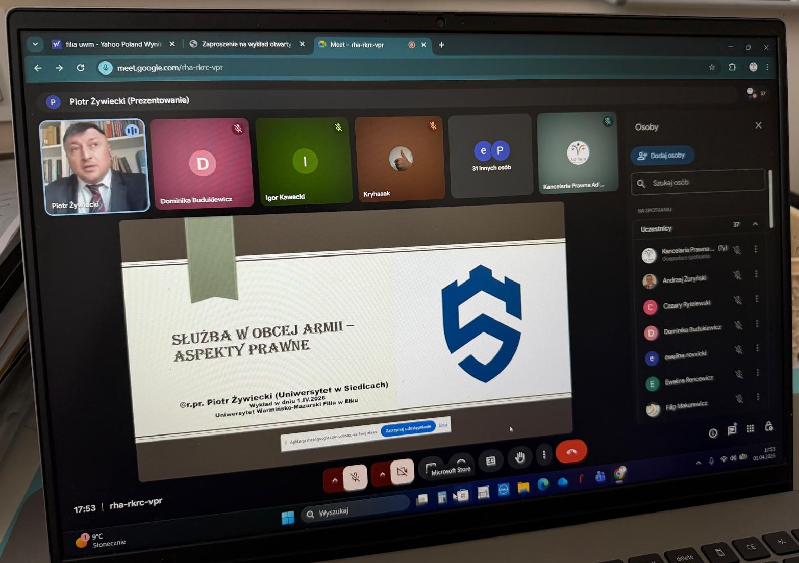 W dniu 1 kwietnia 2026 r. o godz. 17:45 odbył się wykład otwarty pt. „Służba w obcej armii – aspekty prawne”, zorganizowany przez Studenckie Koło Naukowe Fides, działające w Filii UWM. Wydarzenie miało formę spotkania online i zostało przeprowadzone za pośrednictwem platformy Google Meet.