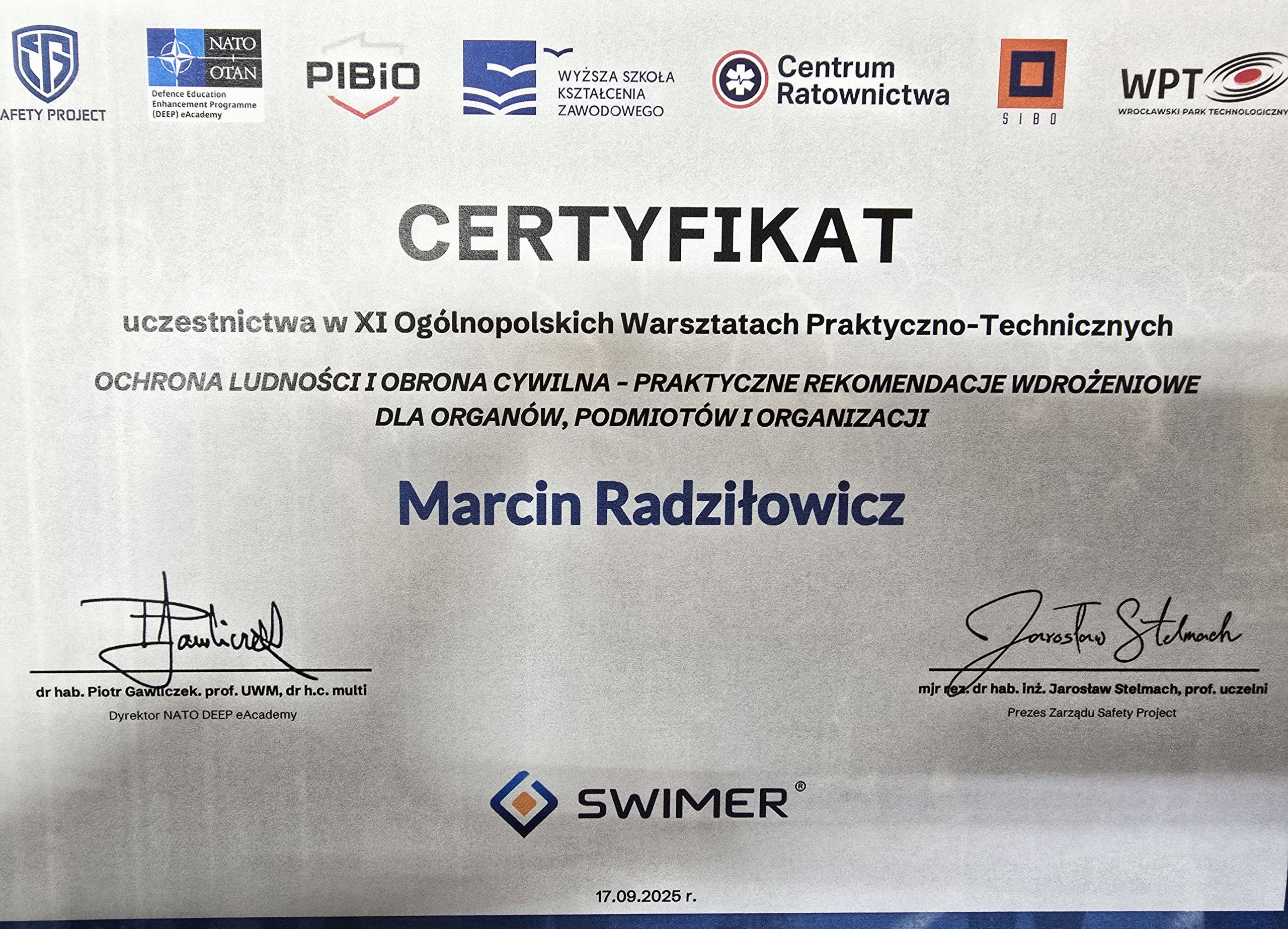 Uczestnicy otrzymali certyfikaty udziału podpisane przez prof. Piotra Gawliczka oraz dr hab. Jarosława Stelmacha, prezesa zarządu Safety Project. Na zdjęciu prezentujemy certyfikat wręczony dr. Marcinowi Radziłowiczowi, Dyrektorowi Filii UWM w Ełku.