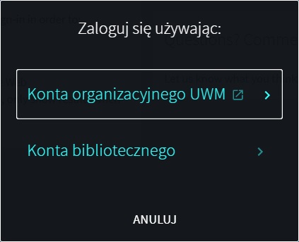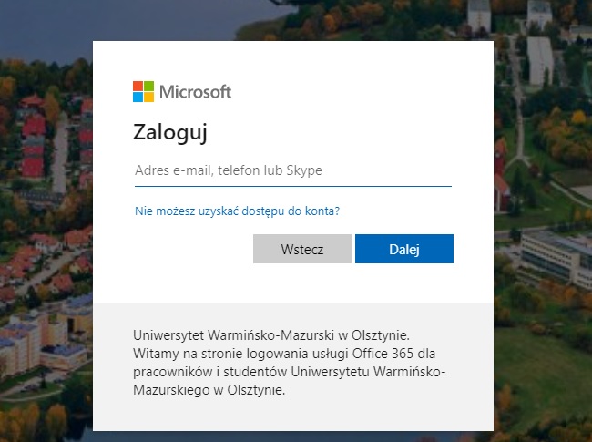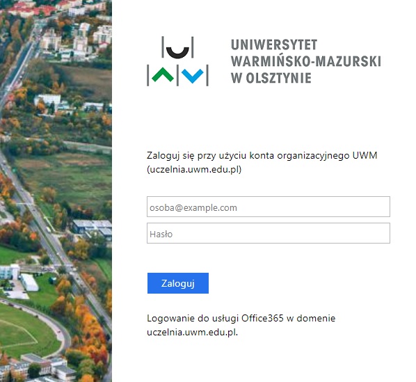 Pojawi nam się nowe okno. Jest ono na tyle kluczowe, ponieważ studenci i pracownicy mogą się zalogować tylko za pomocą "Konta organizacyjnego UWM".