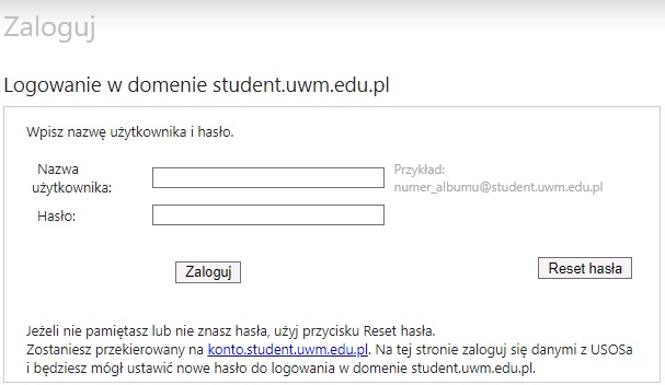 Jeżeli student nie pamięta lub nie znasz hasła, przechodzi na stronę konto.student.uwm.edu.pl. Na tej stronie student loguje się danymi z USOSa i będzie mógł ustawić nowe hasło do logowania w domenie student.uwm.edu.pl.