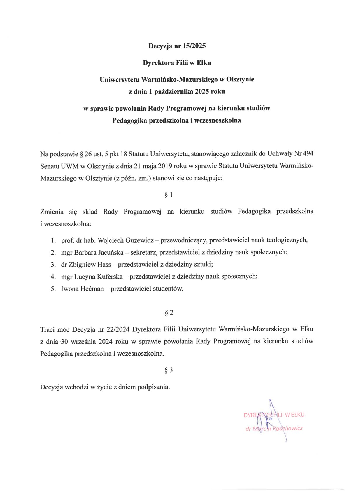 | 15 | 15/2025 | 01.10.2025 | powołania Rady Programowej na kierunku studiów Pedgogika przedszkolna i wczesnoszkolna | Decyzja nr 15/2025 |