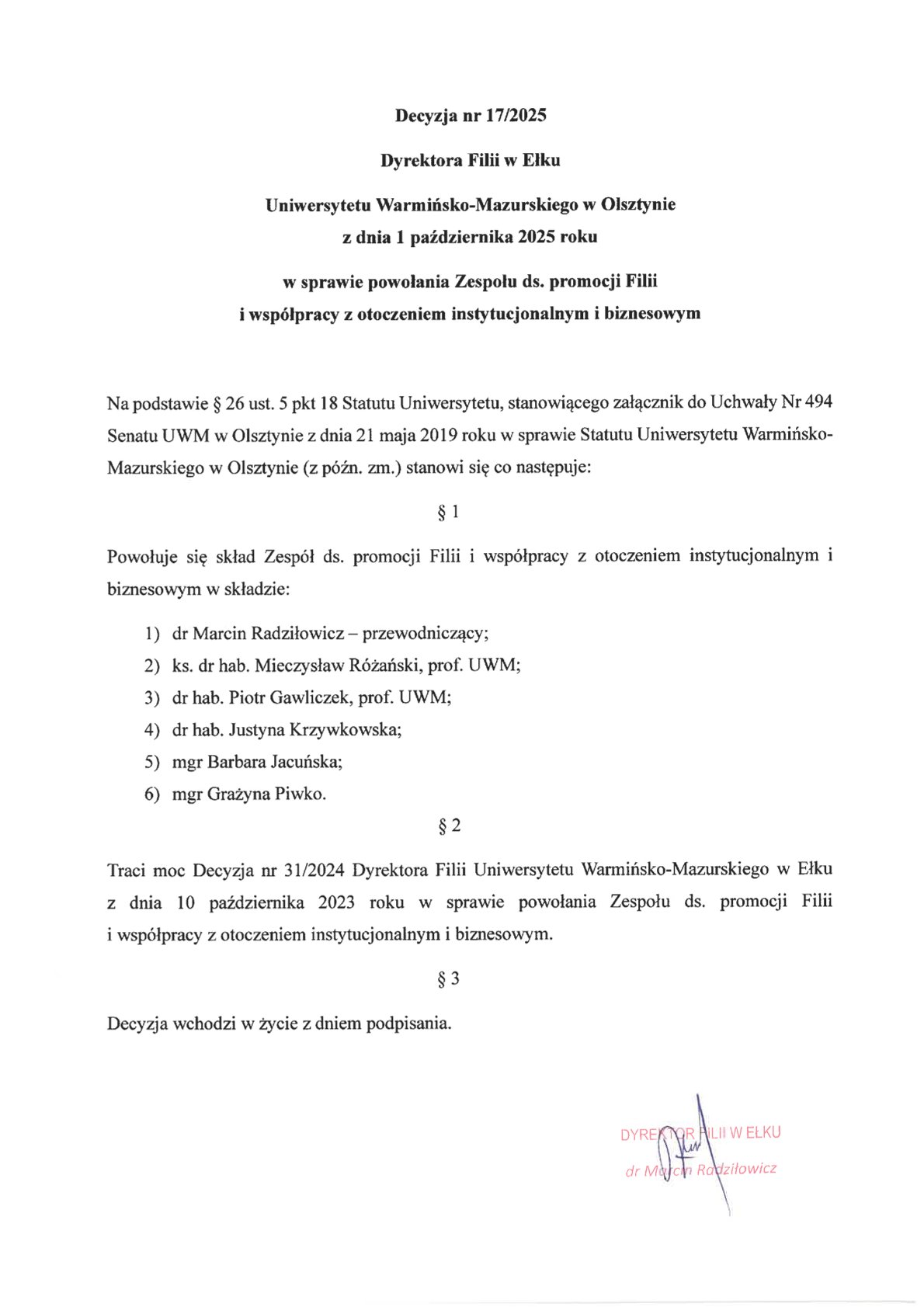 | 17 | 17/2025 | 01.10.2025 | powołania Zespołu ds. promocji Filii i współpracy z otozeniem instytucjonalnym i biznesowym | Decyzja nr 17/2025 |