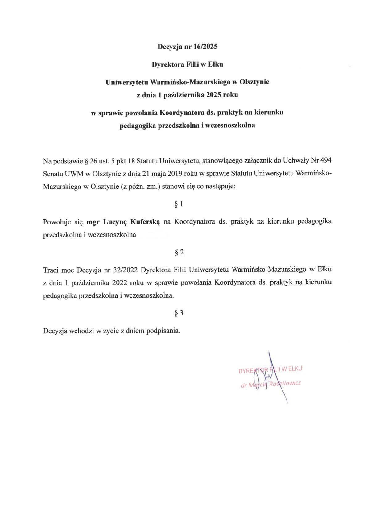 | 16 | 16/2025 | 01.10.2025 | powołanie Koordynatora ds. praktyk na kierunku pedagogika przedszkolna i wczesnoszkolna | Decyzja nr 16/2025 |