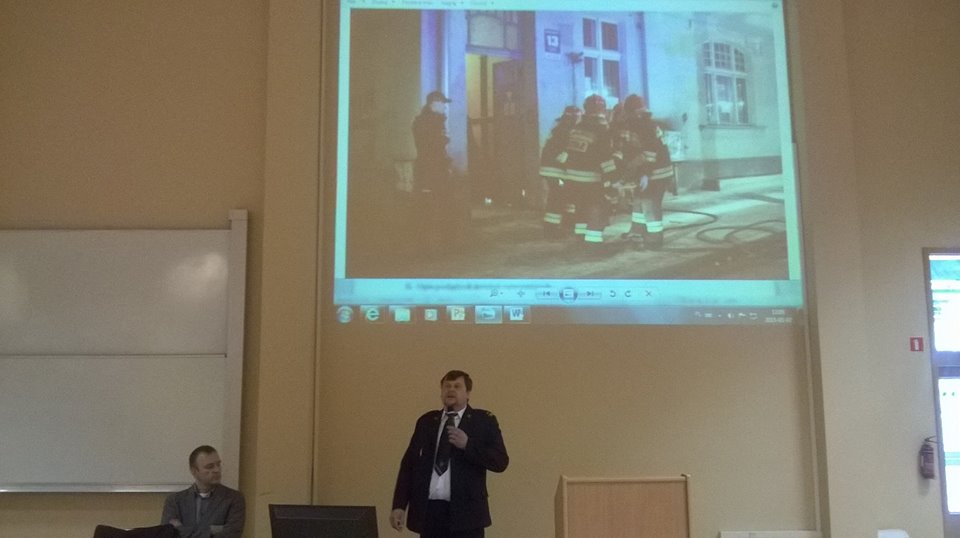 Dnia 7 maja 2015 roku w auli B na wydziale Matematyki i Informatyki Uniwersytetu Warmińsko-Mazurskiego, odbyło się spotkanie z młodszym brygadierem Piotrem Pyzą z Komendy Miejskiej Państwowej Straży Pożarnej W Olsztynie, które zostało zorganizowane przez Koło Naukowe Bezpieczeństwa Narodowego działające przy Instytucie Nauk Politycznych. Podczas wykładu przedstawiony zostały kwestie rozpoznawania zagrożeń pożarowych i innych miejscowych zagrożeń, organizowanie i prowadzenie akcji ratowniczych w czasie pożarów, klęsk żywiołowych lub likwidacji miejscowych zagrożeń oraz wykonywanie pomocniczych specjalistycznych czynności ratowniczych w czasie klęsk żywiołowych lub likwidacji miejscowych zagrożeń przez inne służby ratownicze. Prelegent omówił również zasady opracowywania planów ratowniczych na obszarze miasta oraz przedstawił zasady rekrutacji do służby w straży pożarnej. Pod koniec spotkania zostały przedstawione filmy oraz zdjęcia z akcji, w których PSP z Olsztyna brała udział w ostatnim okresie.