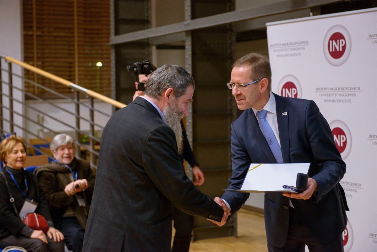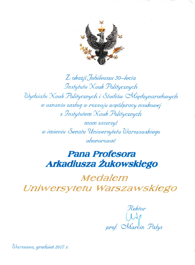 JM Rektor prof. Marcin Pałys, w imieniu Senatu Uniwersytetu Warszawskiego, wręczył prof. Arkadiuszowi Żukowskiemu Medal Uniwersytetu Warszawskiego w uznaniu zasług w rozwijaniu współpracy z tamtejszym Instytutem Nauk Politycznych, Wydziału Nauk Politycznych i Studiów Międzynarodowych.