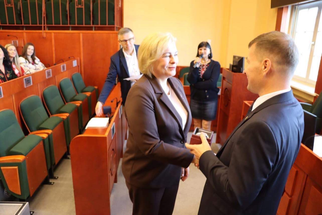 Wyróżnienie wręczył Przewodniczący Rady Andrij Karausz. Pani Profesor jest inicjatorką współpracy od 2019 r. z Uniwersytetem Narodowym Akademia Ostrogska w Ostrogu w Obwodzie Rówieńskim. Dzięki tej współpracy w INP UWM przebywają studenci z Ostroga, odbywają się w UWM staże doktorantów i wykładowców, przygotowywane są wspólne badania i artykuły naukowe, a także rozwija się współpraca przy redagowaniu czasopisma „Copernicus Political and Legal Studies” wydawanego przez prestiżowe wydawnictwo polskie Adam Marszałek oraz ukraińskie Helvetica.