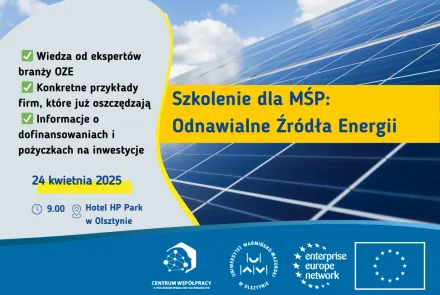Centrum Współpracy z Otoczeniem Społeczno-Gospodarczym UWM w Olsztynie (CWO) zaprasza na szkolenie MŚP - Odnawialne Źródła Energii. Oszczędność i niezależność energetyczna Twojej firmy.