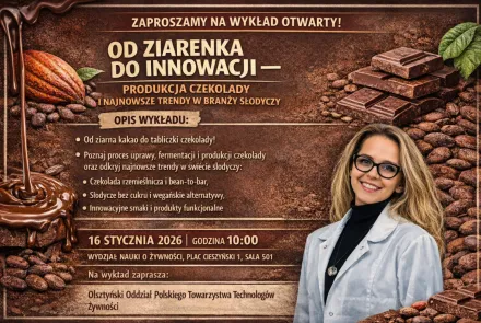 Olsztyński oddział Polskiego Towarzystwa Technologów Żywności oraz Wydział Nauki o Żywności zaprasza na wykład otwarty pt. „Od ziarenka do innowacji - produkcja czekolady i najnowsze trendy w branży…