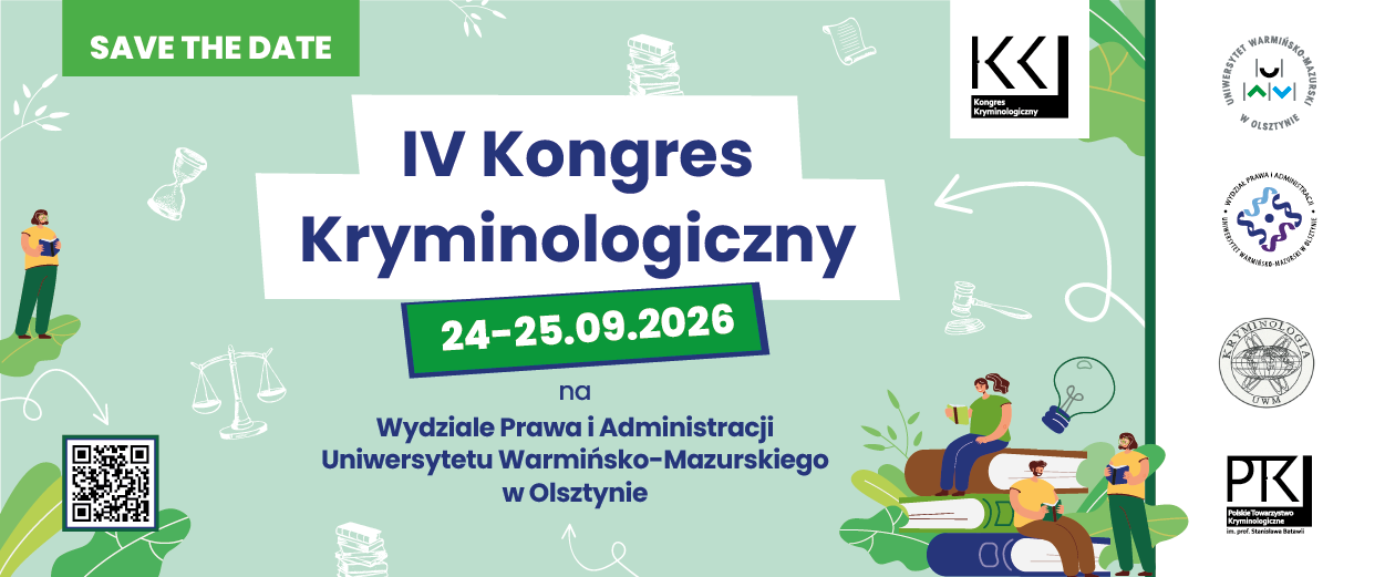 Szanowni Państwo, z przyjemnością informujemy, że tegoroczna IV edycja Kongresu Kryminologicznego odbędzie się w dniach 24-25 września 2026 r. Gospodarzem wydarzenia będzie Katedra Kryminologii i Kryminalistyki Wydziału Prawa i Administracji Uniwersytetu Warmińsko-Mazurskiego w Olsztynie. Kongres tradycyjnie zgromadzi badaczy i praktyków zainteresowanych najnowszymi kierunkami rozwoju kryminologii, wymianą doświadczeń oraz prezentacją wyników badań. Prosimy o zapisanie daty w kalendarzu. Szczegółowe informacje dotyczące tematyki kongresu, zasad zgłoszeń referatów oraz propozycji paneli zostaną opublikowane wkrótce.