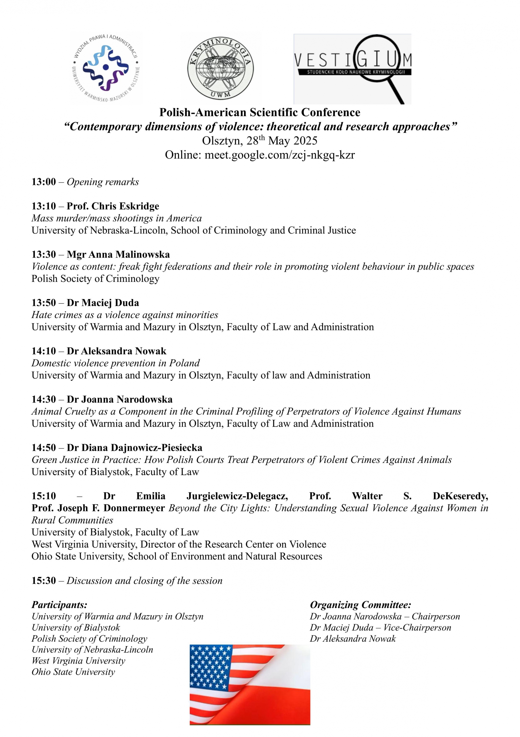 Katedra Kryminologii i Kryminalistyki gości jako visiting professor prof. Chrisa Eskridge reprezentującego University of Nebrasca-Lincoln oraz American Society of Criminology. W związku z powyższym serdecznie zaprasza do udziału w dwóch wykładach otwartych, które odbędą się w dniu 28 czerwca 2025 r. (środa) w auli C -1.01 o godz. 8.00 ("Juvenile Crime Prevention") oraz godz. 9.45 ("Criminological Theory"), a także do udziału online w Polsko-Amerykańskiej Konferencji Naukowej "Contemporary dimensions of violence: theoretical and research approaches", która odbedzie się tego samego dnia w godz. 13.00-16.00 na platformie Google Meet (meet.google.com/zcj-nkgq-kzr).