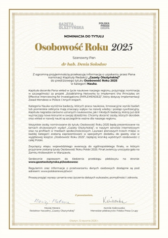 Z przyjemnością informujemy, że dr hab. Denis Solodov, prof. UWM otrzymał nominację Kapituły Redakcji „Gazety Olsztyńskiej” do tytułu Osobowość Roku 2025 w kategorii Nauka. Kapituła doceniła wkład Pana Doktora w rozwój nauki, w szczególności za realizację projektu „Establishing Networks to Implement the Principles on Effective Interviewing for Investigations (IMPLEMENTEDZ)”, dotyczącego wdrażania Zasad Mendeza w Polsce oraz w innych krajach. Plebiscyt „Osobowość Roku” wyróżnia osoby, których działalność naukowa i innowacyjne osiągnięcia mają istotny wpływ na rozwój wiedzy oraz życia społecznego. Laureaci etapu wojewódzkiego awansują do ogólnopolskiego finału, którego zwieńczeniem jest uroczysta gala w Warszawie.