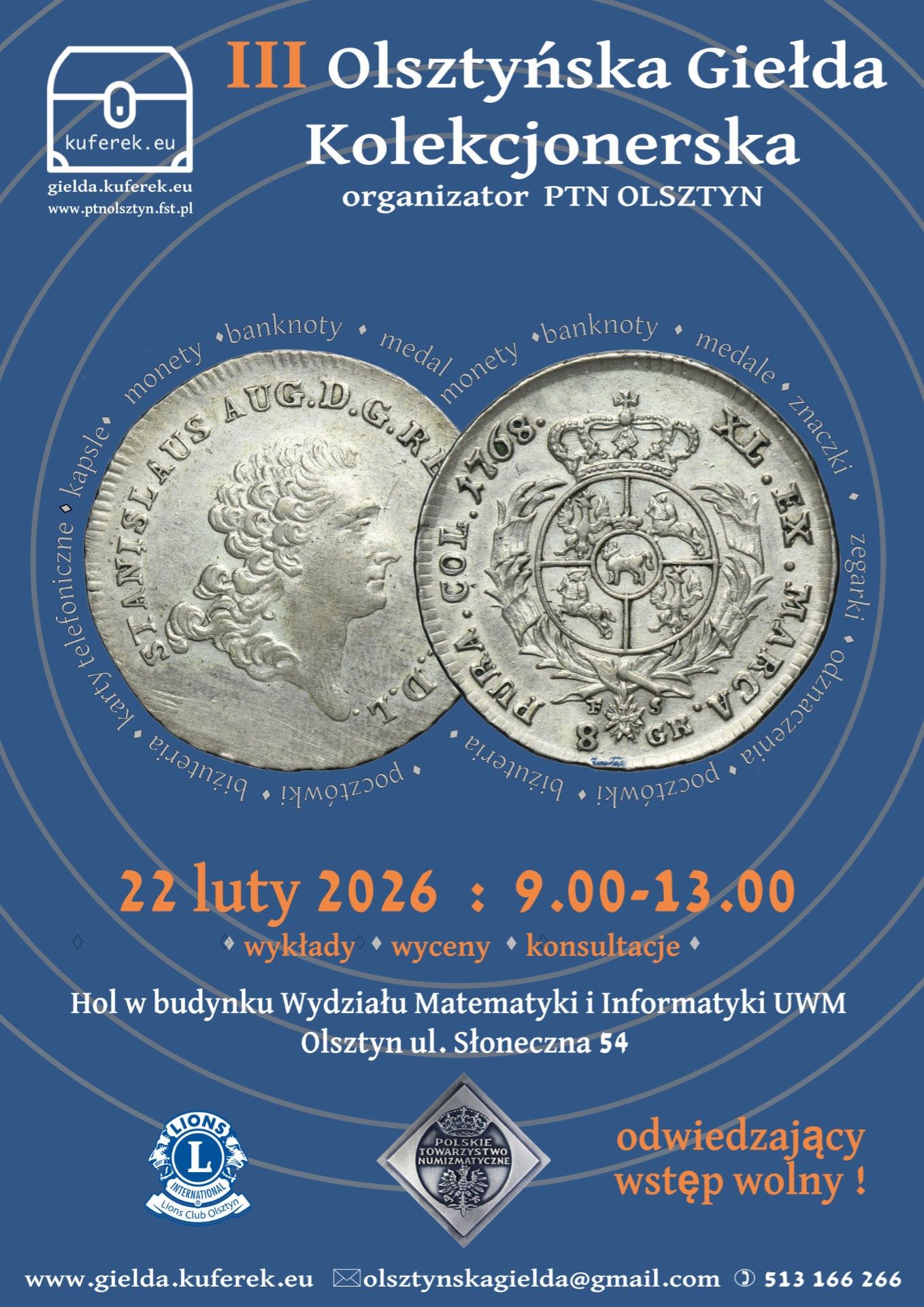 22 lutego 2026 r. (niedziela) w holu Wydziału Matematyki i Informatyki UWM w Olsztynie (u. Słoneczna 54) odbędzie się Olsztyńska Giełda Kolekcjonerska. Zapraszamy w godz. 9:00 – 13:00. Organizatorem wydarzenia jest Polskie Towarzystwo Numizmatyczne Olsztyn.