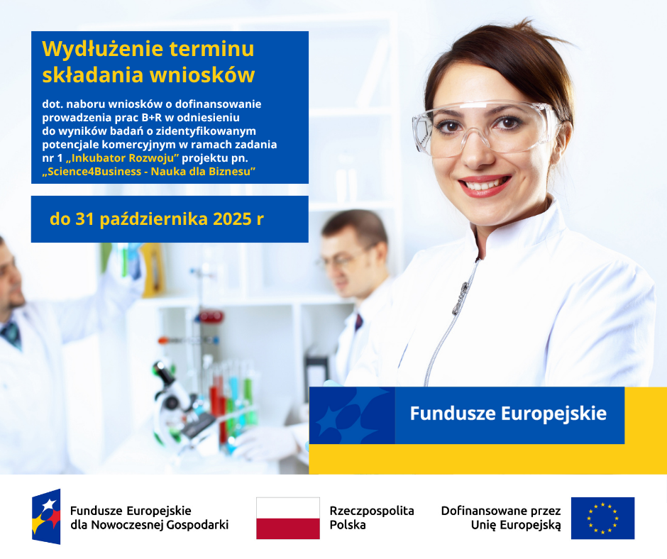 Projekt realizowany jest w ramach zadania nr 1 „Inkubator Rozwoju" projektu niekonkurencyjnego „Science4Business – Nauka dla Biznesu", dofinansowanego ze środków Unii Europejskiej w ramach działania 2.5 Programu Fundusze Europejskie dla Nowoczesnej Gospodarki 2021–2027.