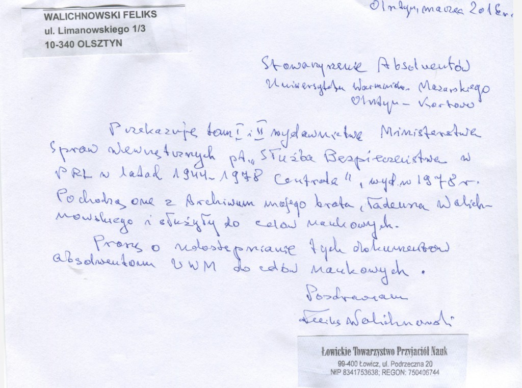 Są to dokumenty z archiwum gen. prof. dr hab. Tadeusza Walichnowskiego przekazane bratu Feliksowi mieszkającemu w Olsztynie i od lat związanemu z uczelnią kortowską.