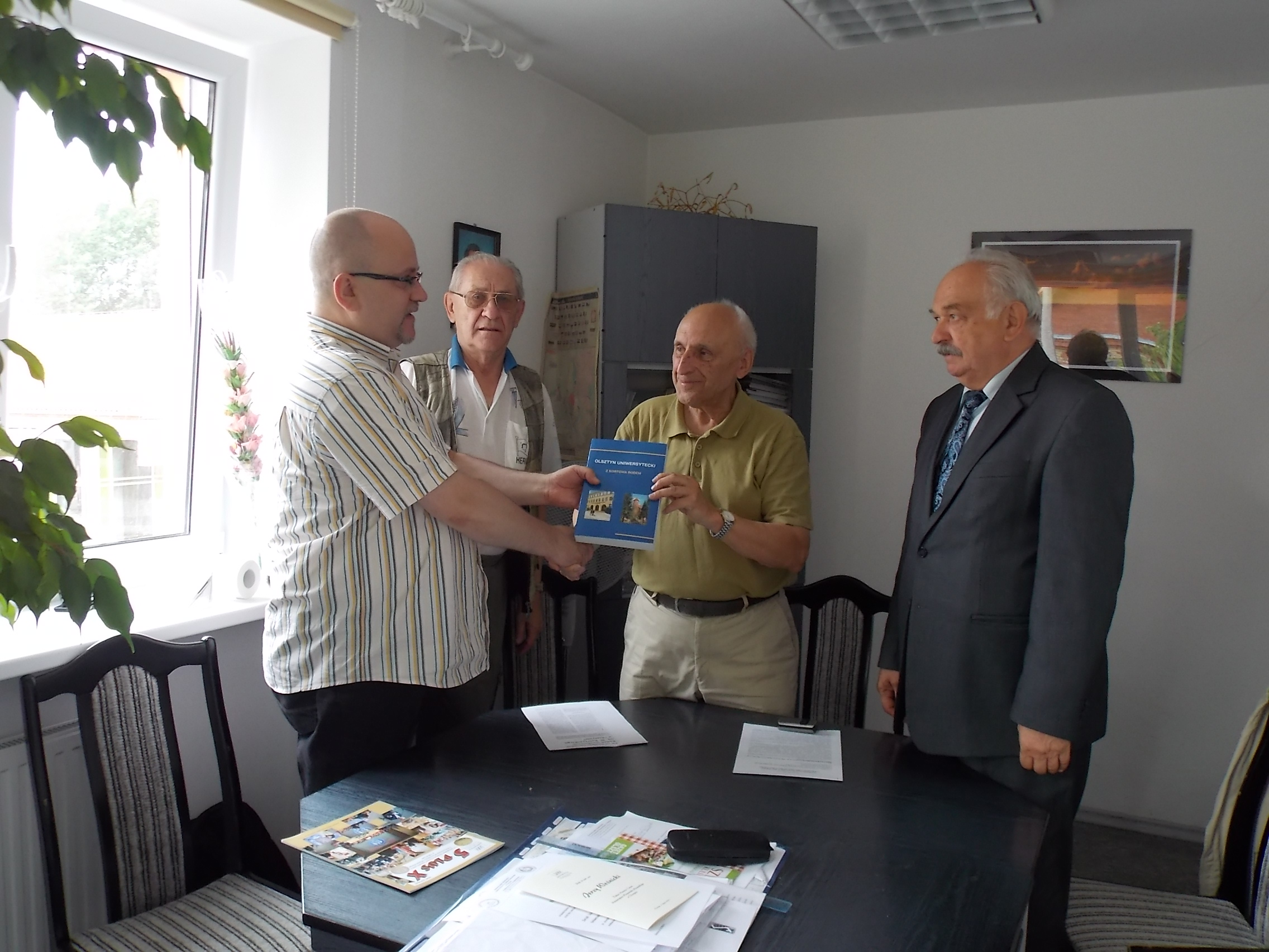 Na zdjęciu: Prof. dr hab. Andrzej Faruga, prezes Zarządu Stowarzyszenia Absolwentów UWM wręcza dr. Rafałowi Wolskiemu ostatnio wydaną książkę ” Olsztyn Akademicki- Nauka, Praktyka, Absolwenci”. Drugi z lewej strony prof. dr hab. Janusz Guziur, z prawej dr Bolesław Pilarek, prezes Zarządu Fundacji im. M. Oczapowskiego.