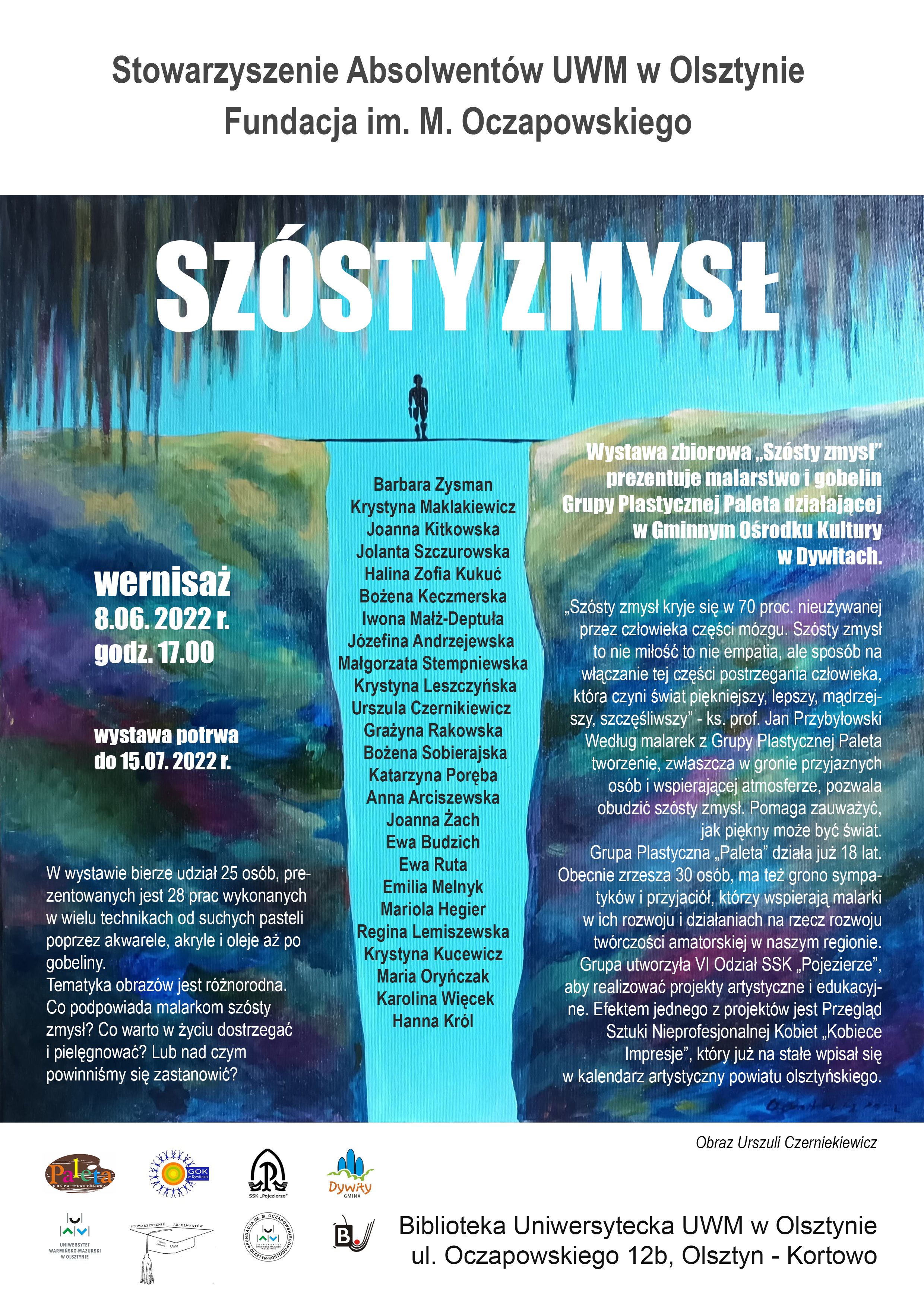 Wystawa  malarstwa i tkaniny artystycznej pt. „Szósty Zmysł” , w Bibliotece Uniwersyteckiej UWM w Olsztynie prezentuje prace dwudziestoosobowej  grupy plastycznej „Paleta”, działającej w Gminnym Ośrodku Kultury  w Dywitach. Grupa pracuje od kilkunastu lat  pod kierunkiem mgr Joanny Kitkowskiej, absolwentki Wydziału Sztuki Uniwersytetu Warmińsko-Mazurskiego  w Olsztynie W grupie tej jest kilka pań – absolwentek olsztyńskich uczelni. Wystawę otworzono w dniu 8 czerwca uroczystym wernisażem , na którym dr Bolesław Pilarek – Prezes Zarządu Stowarzyszenia Absolwentów wręczył autorkom pamiątkowe podziękowania i kwiaty a również wygłosił szeroki wykład o rozwoju organizacji absolwenckich w Polsce i przybliżył historię naszego , patronackiego Stowarzyszenia Absolwentów UWM. Wystawa, na której można obejrzeć różnorodne  prace malarskie w technikach oleju, akrylu i akwareli oraz dwa piękne gobeliny  w  będzie dostępna do zwiedzania do końca lipca tego roku.