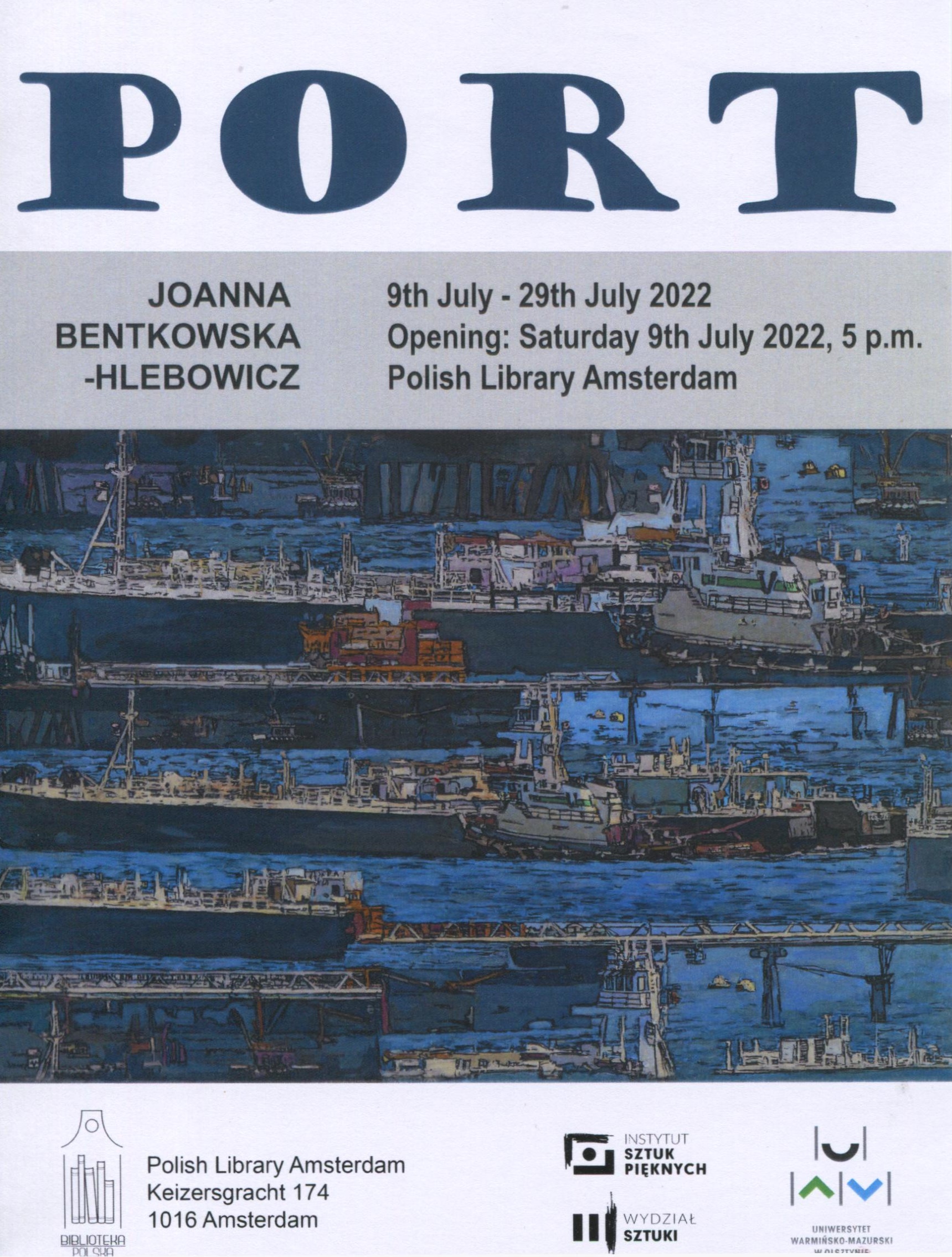 Tam (w Holandii – w Amsterdamie) trwa również wystawa prac dr Joanny Bentkowskiej-Hlebowicz. Wernisaż odbył się 9 lipca br. w Bibliotece Polskiej (wcześniej działał tu Dom Polski). Oprócz działalności bibliotecznej odbywają się tu wystawy, warsztaty, występy, prelekcje na temat książek i sztuki, spotkania z aktorami, pisarzami i poetami. Biblioteka skupia środowisko Polonii Holenderskiej. Wystawa pt.: „Port” prezentuje 15 prac na papierze formatu 50×70, przedstawiające motywy morskie. Potrwa również do końca wakacji.