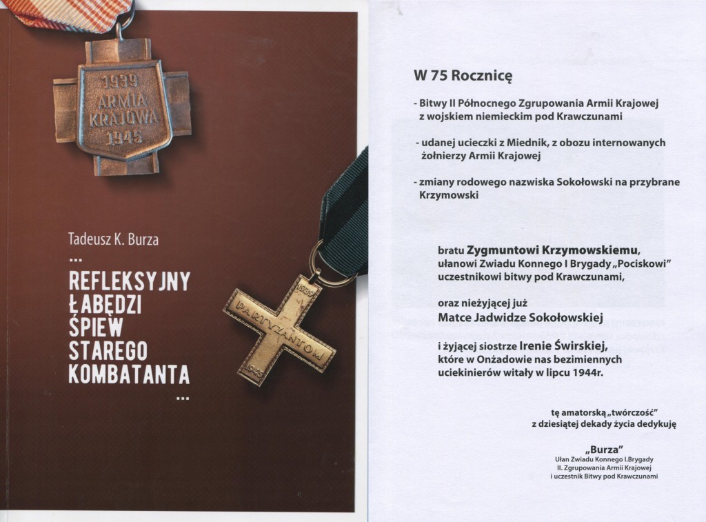 Burza” Ułan Zwiadu Konnego I. Brygady II. Zgrupowania Armii Krajowej i uczestnik Bitwy pod Krawczunami w 75 Rocznicę Bitwy II Północnego Zgrupowania Armii Krajowej z wojskiem niemieckim pod Krawczunami, udanej ucieczki z Miednik, z obozu internowanych żołnierzy Armii Krajowej i zmiany rodowego nazwiska Sokołowski na przybrane Krzymowski wydał książkę pt: „ REFLEKSYJNY ŁABĘDZI ŚPIEW STAREGO KOMBATANTA” . Tę amatorska twórczość z dziesiątej dekady życia – jak napisał- zadedykował bratu Zygmuntowi Krzymowskiemu, ułanowi Zwiadu Konnego I Brygady„Pociskowi” , uczestnikowi bitwy pod Krawczunami oraz nieżyjącej już Matce Jadwidze Sokołowskiej i i żyjącej siostrze Irenie Świrskiej, które w Onżadowie nas bezimiennych uciekinierów witały w lipcu 1944 r.